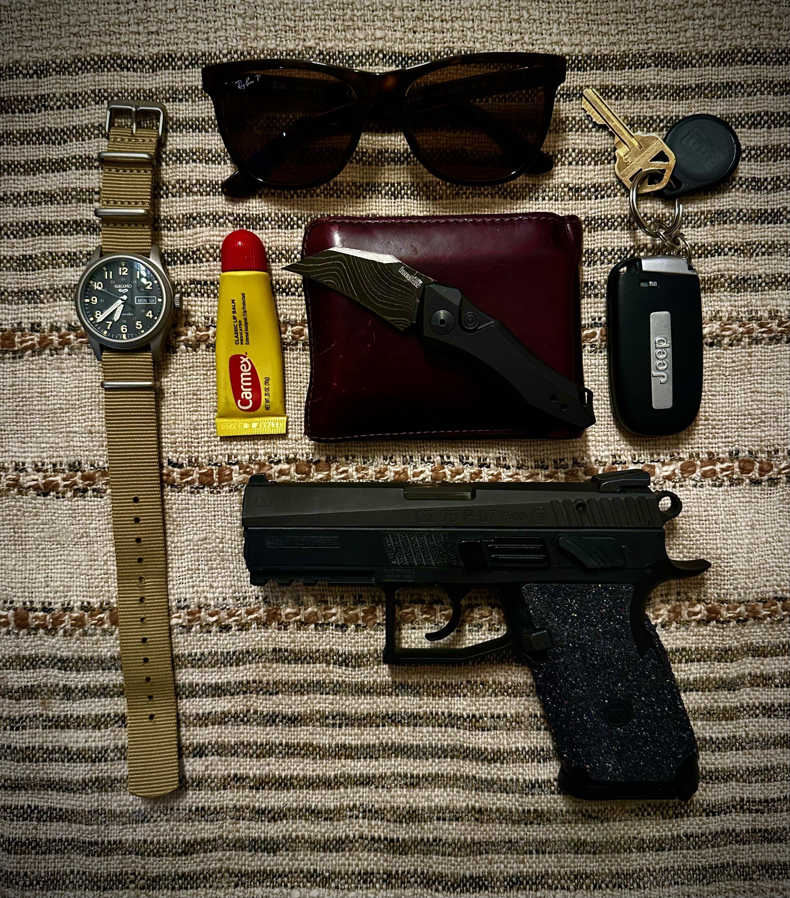 In EDC Current EDC 27M February 10, 2026 – Seiko SRPG35– Carmex – Raybans polarized– Fossil leather wallet– Kershaw Launch 10 Damascus– Cherokee/Work/House Key– Cz P07 Duty / Talon gripsby DirtyDon-44 EDC Prev Post Milled Monday (‘Merica) February 10, 2026 Next Post New Knife Day… February 10, 2026 Related Posts My EDC/18y/M/Portuguese February 10, 2026 Since I apparently have a bad habit of breaking multitools (it is a me problem, I’m sure😅). This has been my EDC for the past couple weeks. Loving it so far! February 10, 2026 22M Simple EDC February 10, 2026 2 Comments AutoModerator 4 hours ago Thank you for posting to r/EDC! Include a detailed item list (make/model) within **1 hour** of submission. Lists can go in the title, a comment, or the image. Posts without lists will be removed. If you have already provided a list, not further action is needed, thanks | [FAQ](https://www.reddit.com/r/EDC/wiki/faq)*I am a bot, and this action was performed automatically. Please [contact the moderators of this subreddit](/message/compose/?to=/r/EDC) if you have any questions or concerns.* Dom882 3 hours ago Great carry🔥🔥🔥Write A CommentYou must be logged in to post a comment.