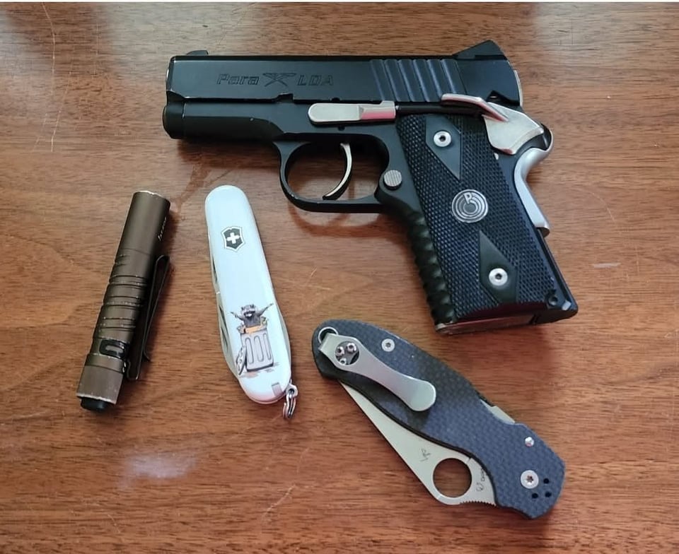 Pic #2: Olight I3T flashlight, Victorinox Trash Panda knife (SMKW exclusive), Para LDA .45 ACP, and Spyderco Para 3 carbon fiber with S90V steel.