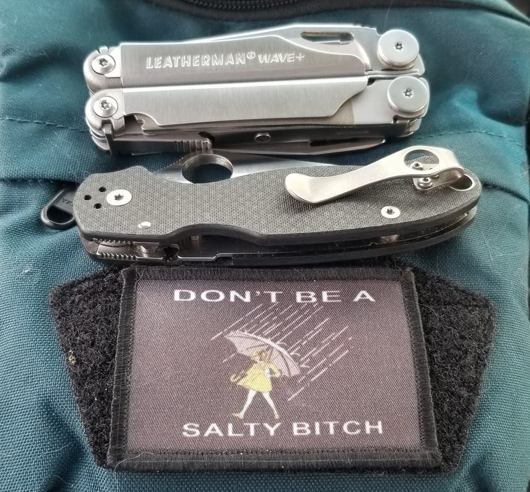 Pic #1: Leatherman Wave, Spyderco Para 3 carbon fiber & S90V steel, Maxpedition convertible backpack small, and patch.