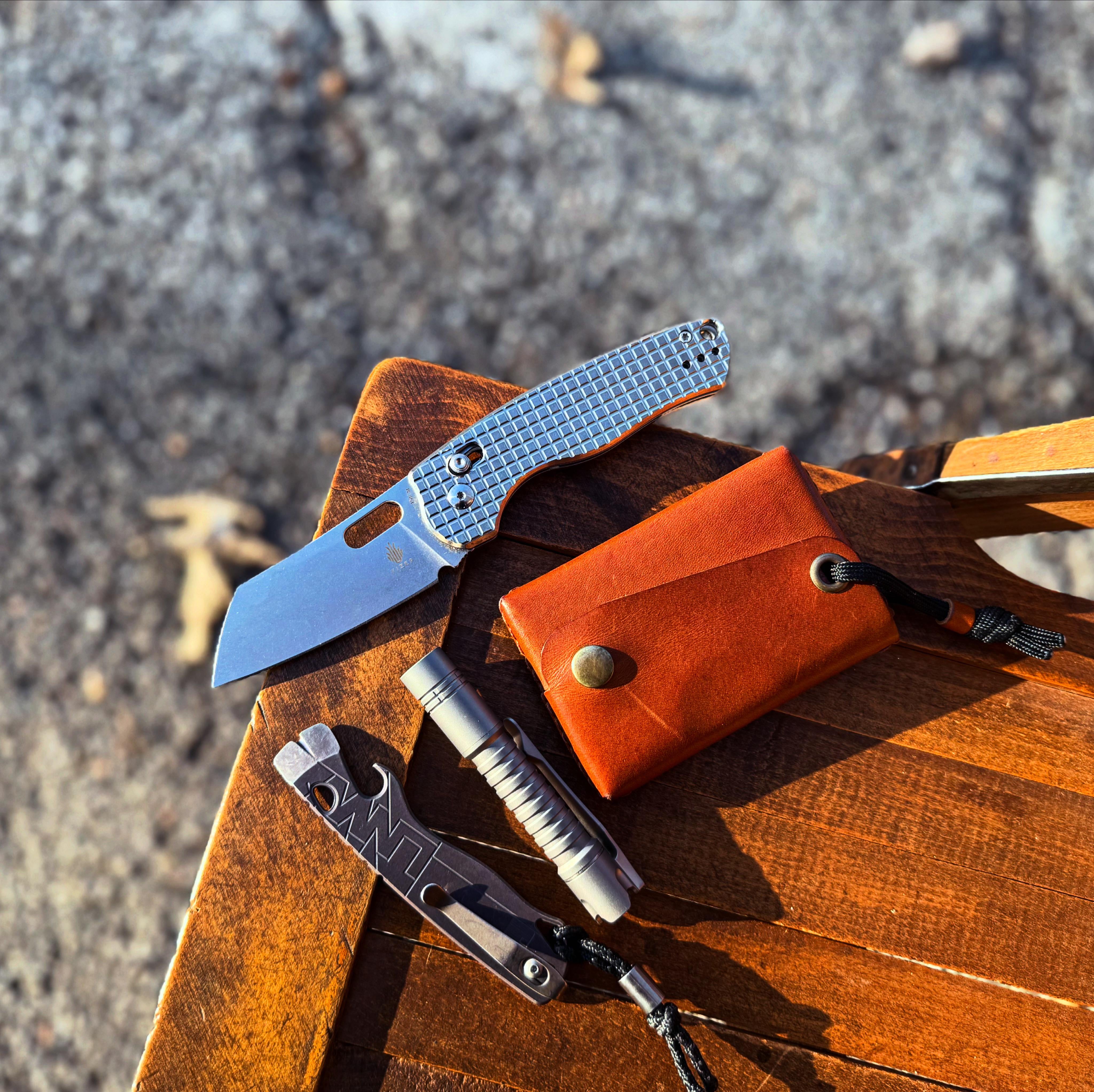 Kizer Towser K Mini (WMK Exclusive), LynchNW Prybar, Reylight Pineapple Mini MK3, StorksBeakLeather wallet.