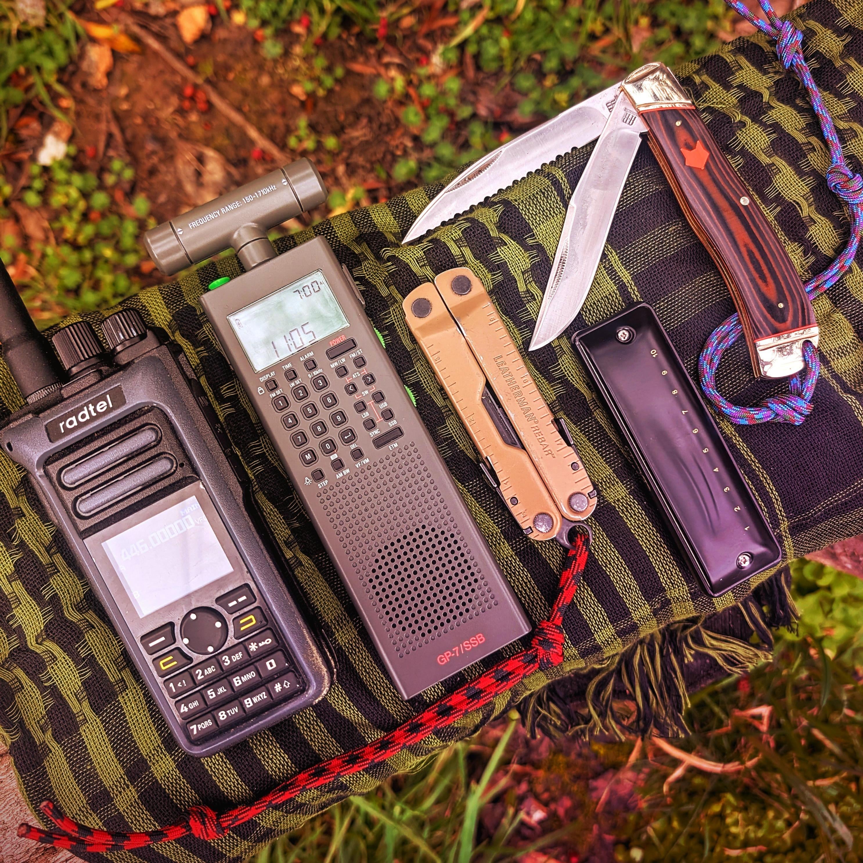 – Radtel RT-752 ham radio – Countycomm GP-7 SSB wideband receiver – LM Rebar – JDR Ninja harmonica – Rough Ryder Desert Fox Jumbo Trapper (serrations mod) – Green shemagh from idk where
