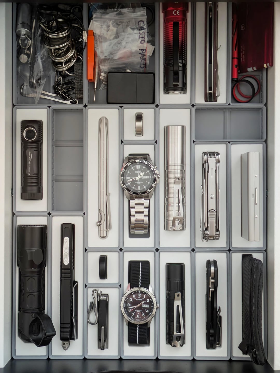 Top row (left to right) * Misc key organizers and other stuff * Olight Warrior 3S * Civivi Incite * Olight Open Mini, Victorinox Swisscard Classic, some silicone rings