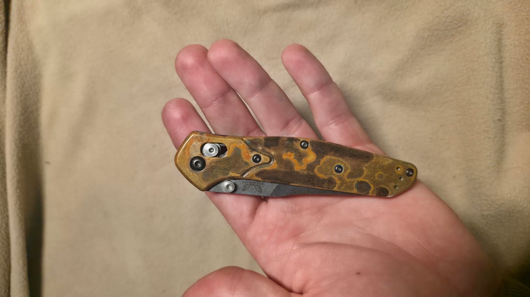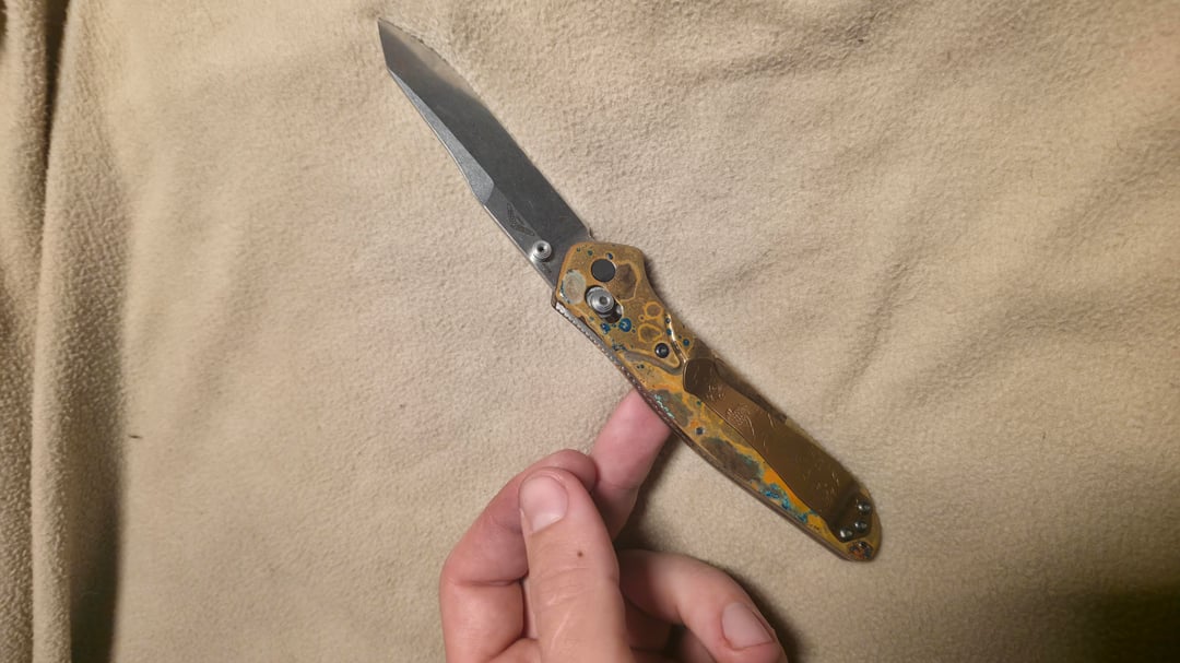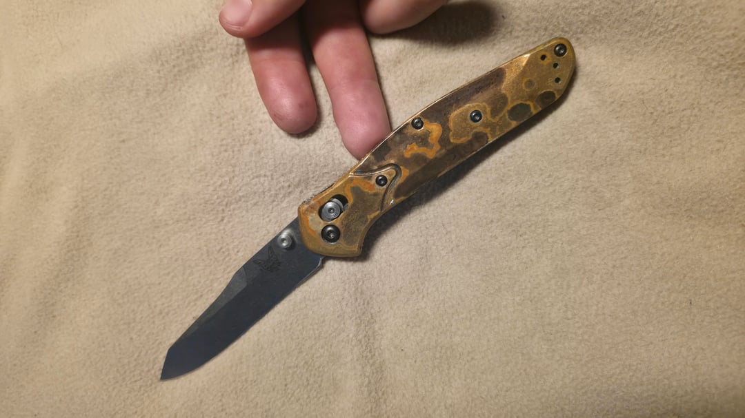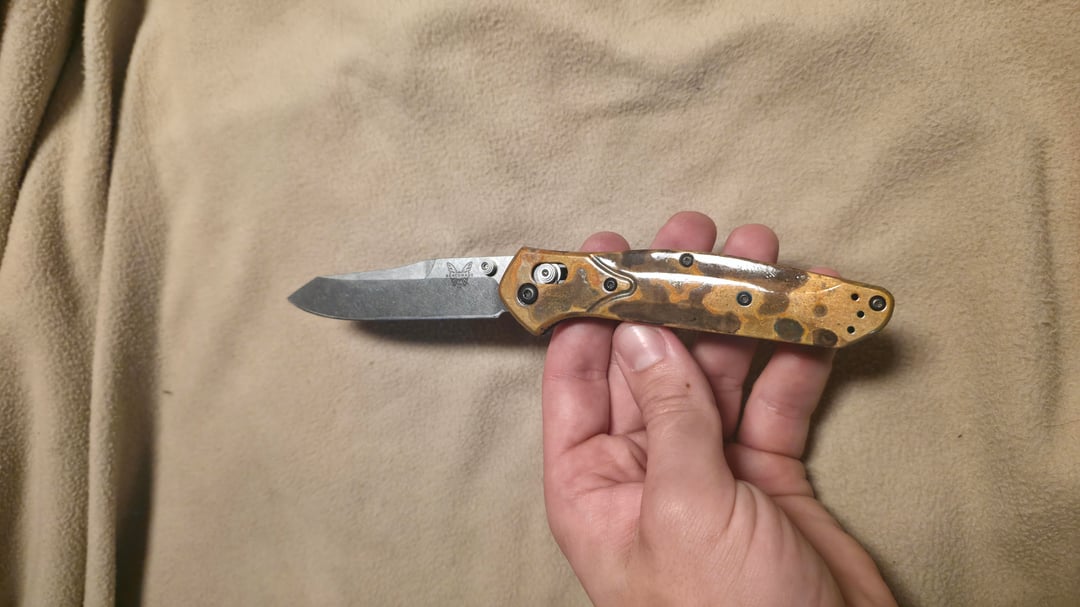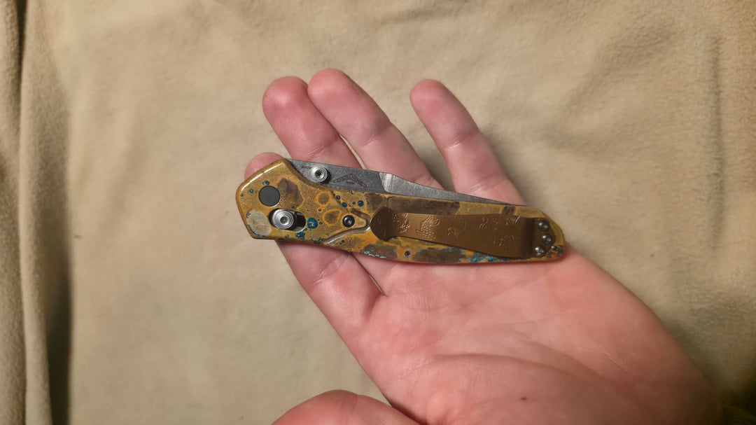 Lightly shipwrecked and gloss lacquered 940 Osborne. I could not be any happier with this knife. The weight, the look, the smooth glossy feel of the laquer… perfection in hand 🥹 the only thing that could make this better would be for the axis and thumb stud hardware to color matched the clip, or vice versa because this clip didnt have the desired look I thought it would.