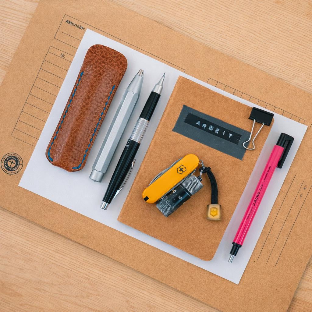 These are the things I carry with me at work. Nothing too special, just things that help me get my work done. The Rambler is a knife that I have carried for years, and it’s so handy. I own many Swiss Army knives and I really love the SwissTool, but the Rambler is the perfect companion in the office. I carry a notebook, a mechanical pencil, an eraser, and a ballpoint pen to sketch and take notes. Using a small notebook has changed a lot for me!