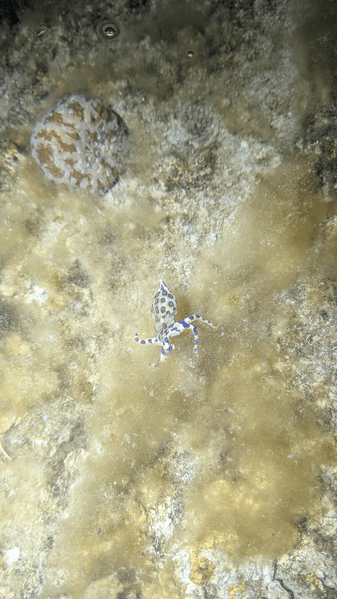 No really though. Had I been using a light with less spill or flood it might have creeped up on me unnoticed. I was working a big octopus put of a hole when this small yet deadly blue ring octopus came over to see what all the commotion was. Underwater moth??
