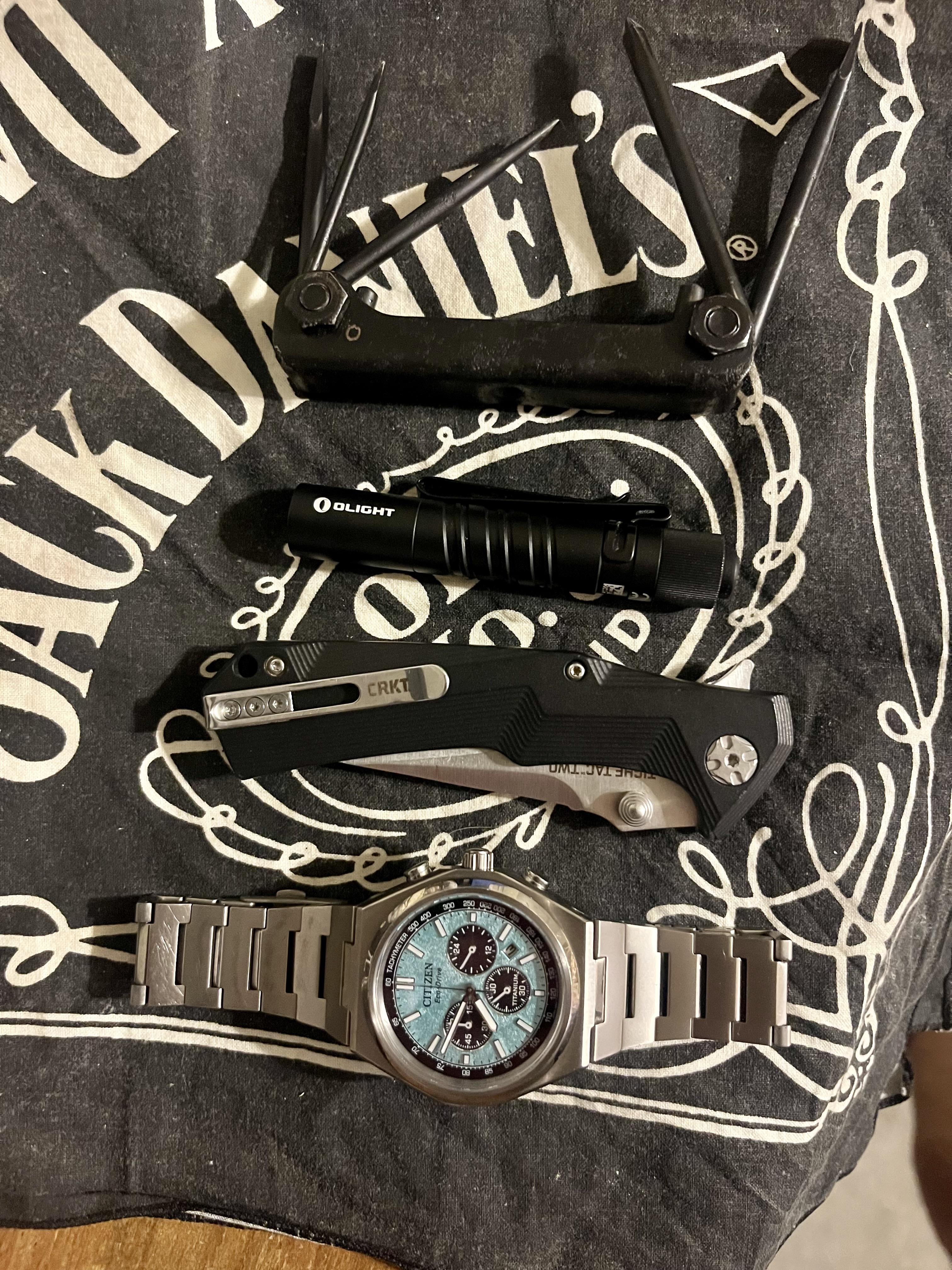 Citizens titanium watch, CRKT TIGHE TAC TWO, i3T Olight, a bandana and a super old multitool from the 1950s my grandfather passed on to me.