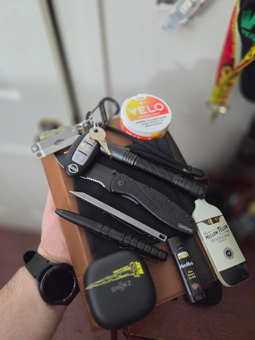 Today's carry! I didn't have much going on today so i tried to stay minimal. The necessities in the first pic are my Bible, a DRYKI Hank, Nitecore MT2A Pro Light, Kershaw Blur, The Mighty Bar LT, and a 5.11 Kubaton Pen. In the 2nd picture i've added the less essential, Velo Tropical Heat Pouches, Shokz OpenFit2 Earbuds, Mellow Fellow Penjamin, and VanMan Tallow Lip Balm. Have a good weekend, Christ is King!