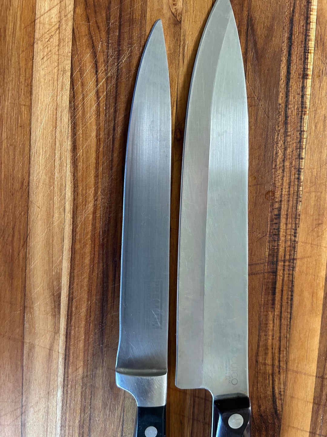 This was harder to photograph than I anticipated. It doesn't look like much, but on a chef's knife, if you can't use the heel of your knife, it's basically useless. On that particular knife, which has a 10 inch blade, maybe the center two or 3 inches are usable. On the slicer it's not such a big deal but it was a good example of the divot. Also, I hope I'm posting this as a reply to my original post but like I said, I'm not that great at Reddit. thank you all for your replies, I really appreciate it.