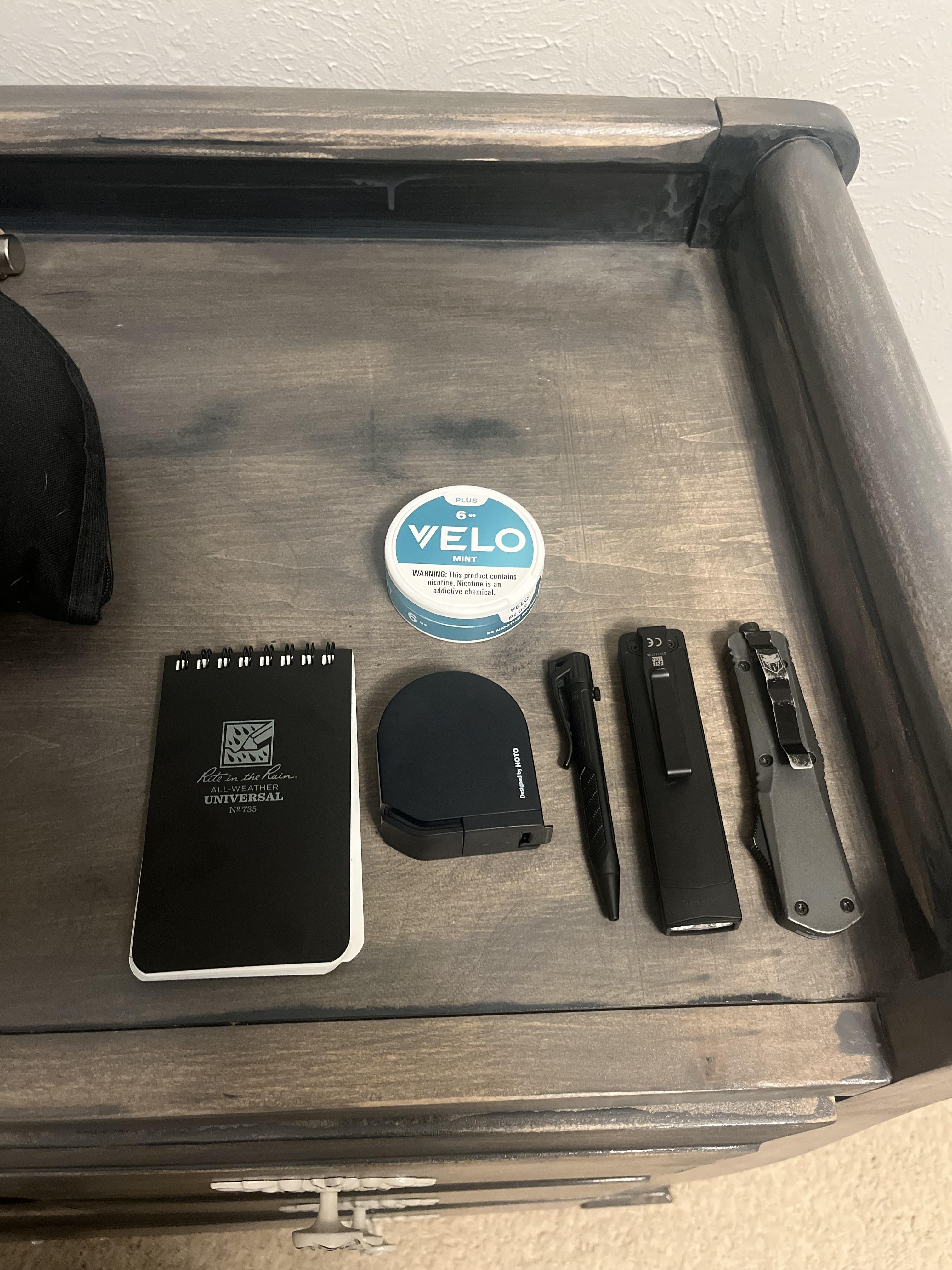 Rite in the Rain pocket notebook, Rite in the Rain bolt action pen, Olight Ark Field Pro Flashlight, Hoto pocket measuring tape, Cobra Switch Blade, and 6mg Mint Velos.