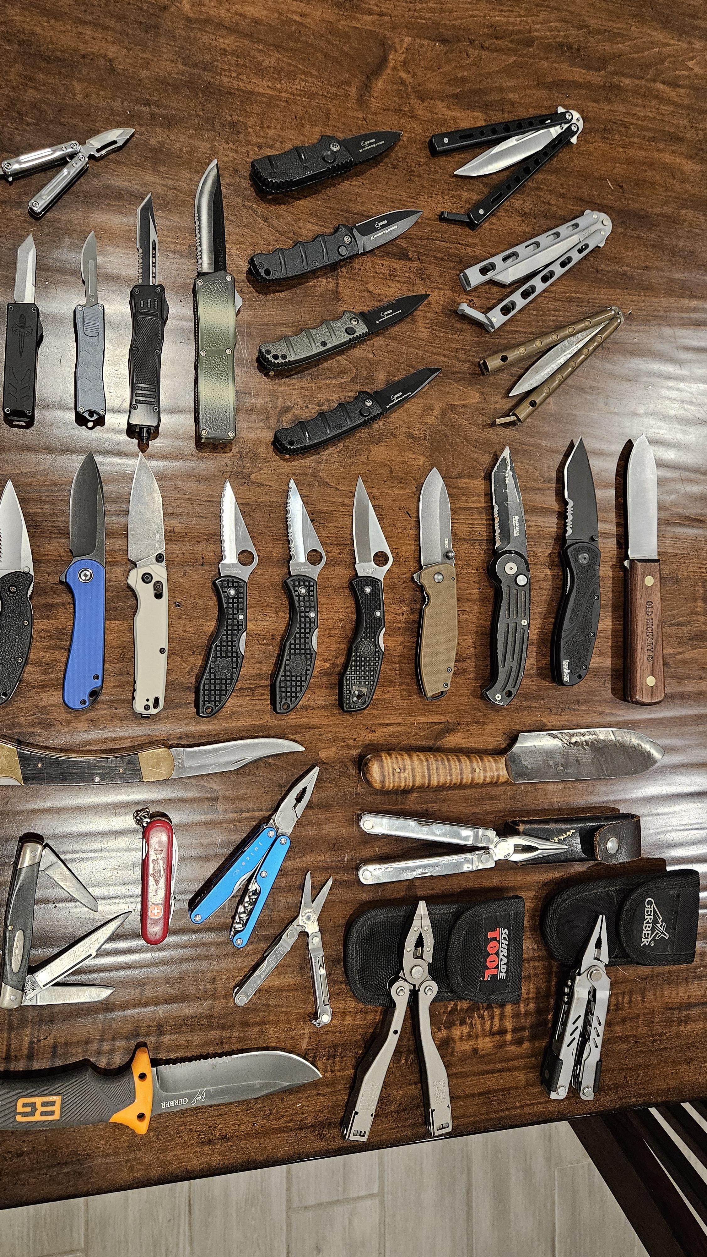 Today is NKD for me. Fun fact, I dont consider myself a knife collector. But when I stopped and thought about it, maybe I am?!?!? Below is my assortment that I recently rounded up from the various places around the house. Few stories behind this mess: my first love affair was with the brass butterfly knife when I was about 6 years old. My father was a sheriff and this was something confiscated that ended up in the garage. I got a toy butterfly knife from pick-n-save crica 1986/87 and taught myself the basics of handling it. Scared my parents half to death when they first saw me demonstrate on the real knife when I was in 2nd grade. The Buck 110 was my father's, he carried it on duty since the late 70s. The Kershaw Scallion purchased when I went off to college in 2001 and used to cut twigs/leaves/branches in my forestry and dendrology courses for plant identification. The plane blade Spyderco Delica I bought on eBay in 2004 but the guy send me the wrong model and refunded my entire cost ($20), thus a free knife and exposing me to truly sharp blades. Spyderco replaced the clip during a sharpening some years ago. The two serrated Delicas are Gen 1 models with plastic molded clips TSA confiscated I purchased on eBay. One had the tip chipped off but Spyderco reprofiled it and sharpened it for a small fee. The OTFs and Boker autos are what I'd buy myself, wife, and son for stocking stuffers over the years. Most recently I bought the Bel Air new and Elementum used. I have a Kershaw Mini Iridium arriving today, so NKD when the mail comes today. Been fun to walk down memory lane via my knife collection. I could go on but I digress.