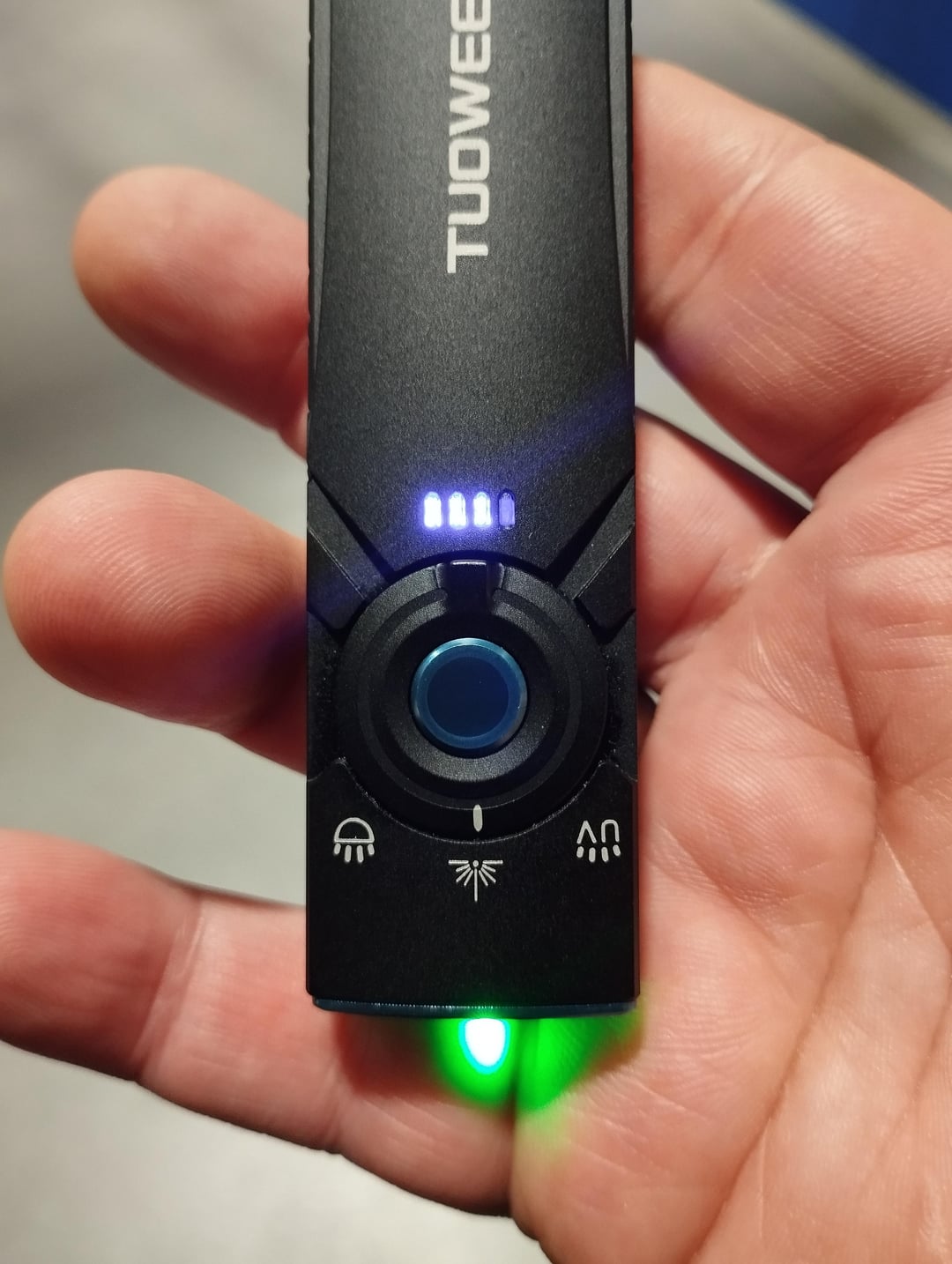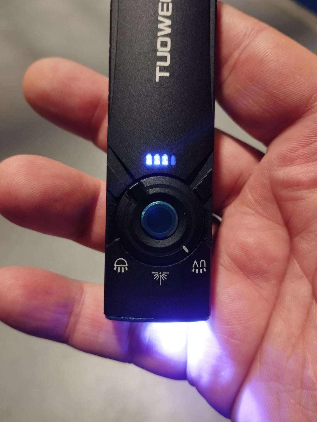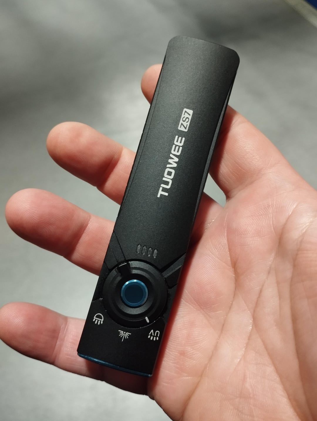 It costs about $36 on AliExpress. It shines decently. I can believe the 1000 lm claim because the HD01 is brighter. There’s nothing to complain about laser and UV. It charges magnetically on the back. We’ll see how long it lasts