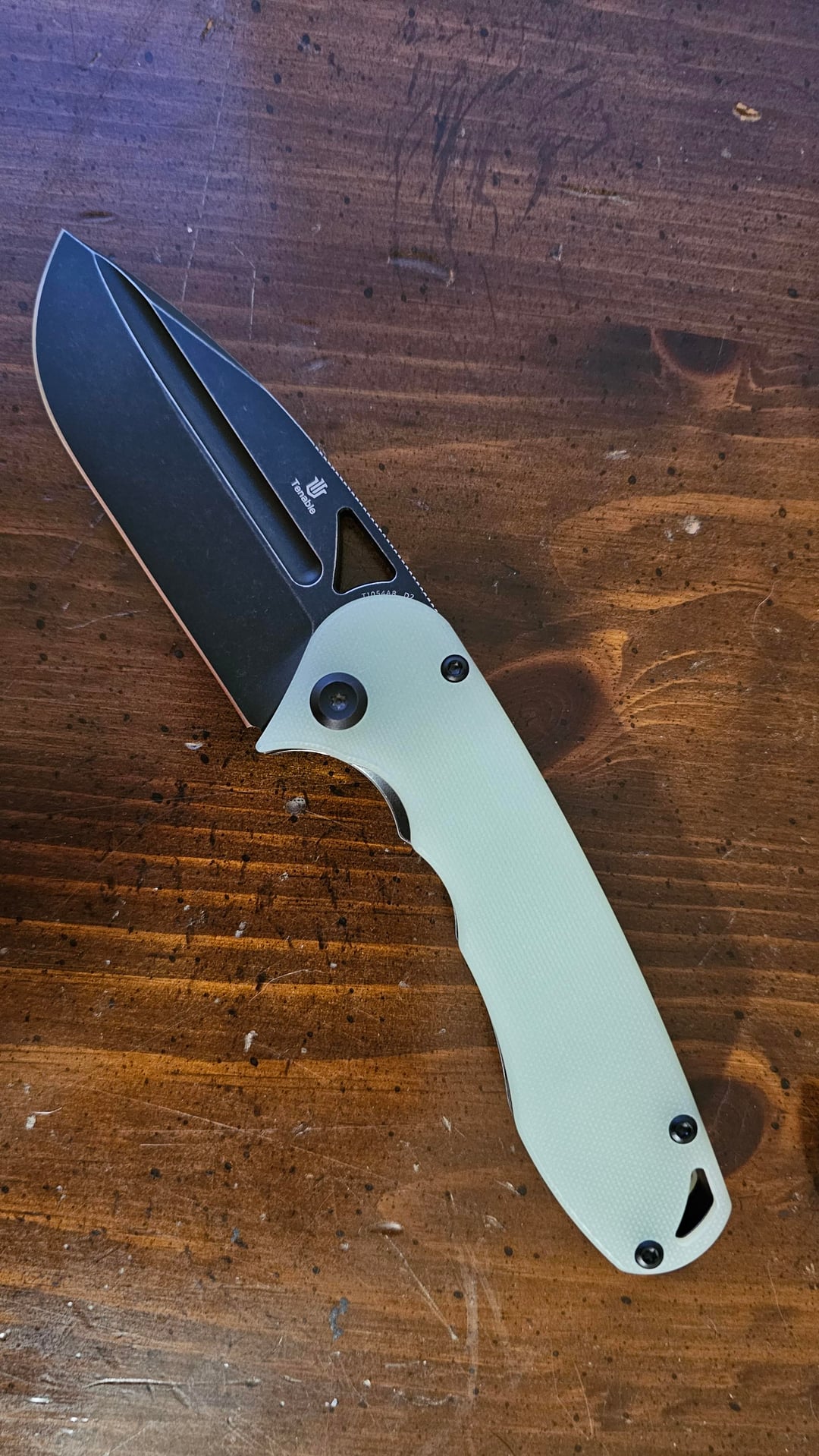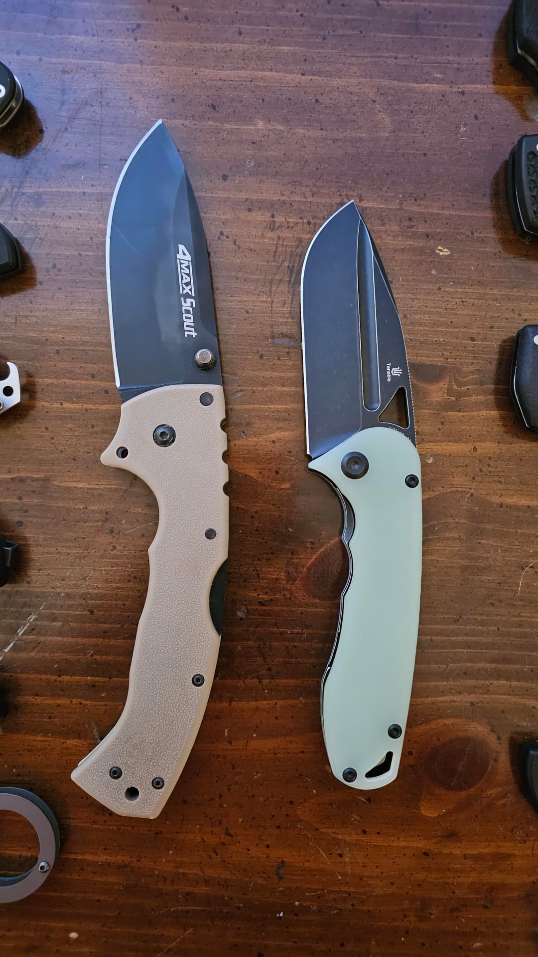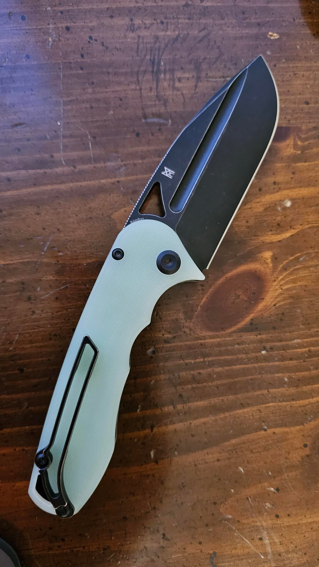 Midgards Messer designed, in D2 and jade G10. Included a comparison to a cold steel 4max just so its size comes across. Like its namesake it is THICK, on par with a 4max or similar. Surprisingly easy to carry though, the G10 cuts down on the overly grippy problem of the other handle scale offerings. Might end up dying the scales at some point just to put my own spin on it.