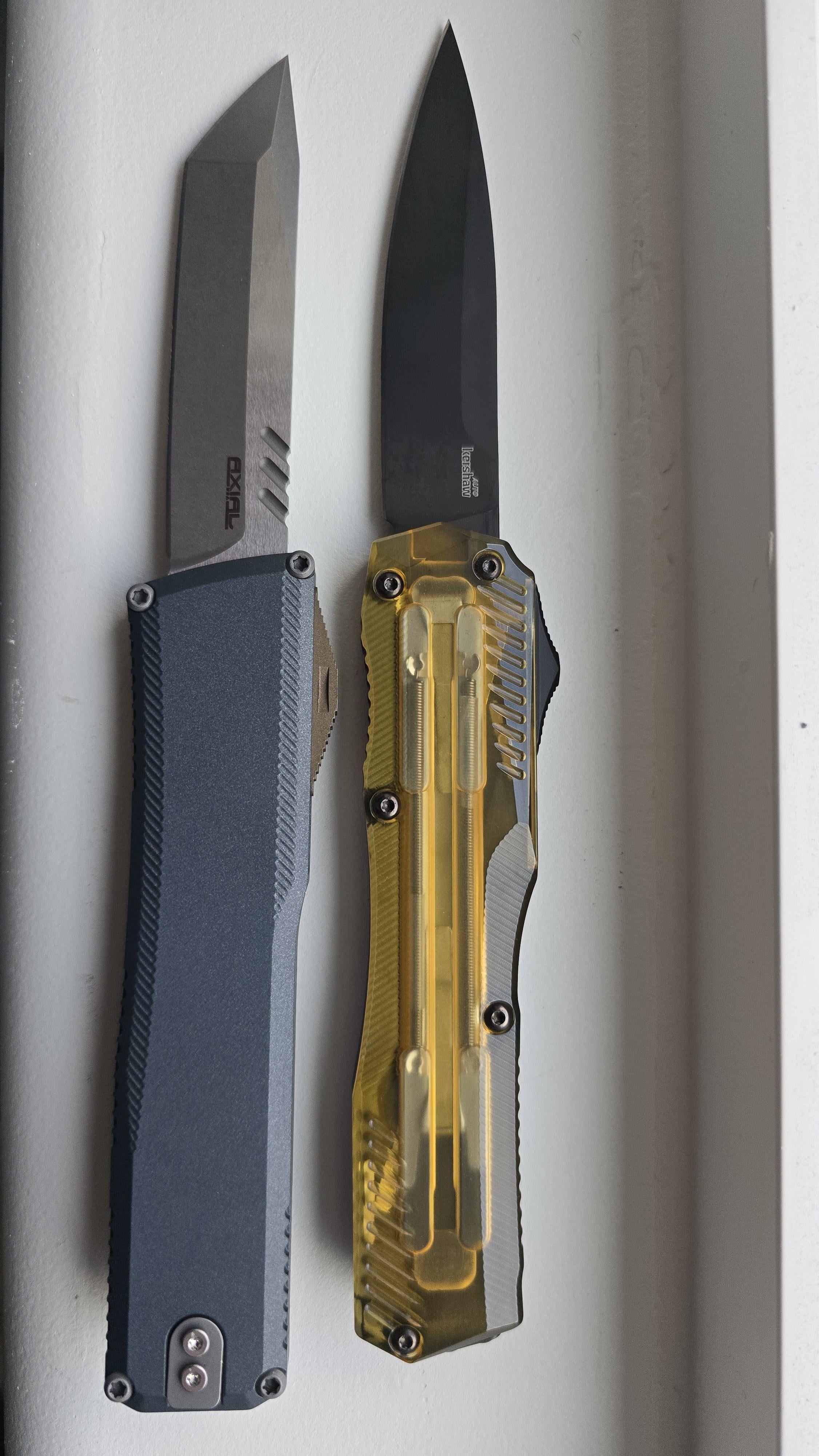 TLDR: The livewire is great, but the shift is better. I caved and bought both. Kershaw livewire ultem variant and the axial shift v3 navy blue/bronze tanto. They are both great knives. They both are dead reliable, with smooth actions. They both have magnacut blades. The kershaw is a fantastic knife and will get plenty of pocket time, but there are some things that I don't love. Its a little slippery. That may be due in part to the ultem used on mine, but even the button and the jimping on the chassis are not very aggressive. I find that in order to actuate it you must adjust your grip. The tiny pocket clip is pretty annoying when trying to get it out of a back pocket. The action is very smooth, but has a very slight ting/ring sound, though it is hardly ever noticeable. The visual esthetic of the ultem is hard to beat, but even with a standard aluminum topped version it looks good. The shift is just different. The action is some how smoother, the snap harder. No ringing here, just a solid thwack on the way out and again on the way in. The body has less curves but much more grip. The button never slips, and there is no readjusting needed for a good grip on the body. The pocket clip is full sized, machined, deep carry. I rarely see the point in mentioning the blade play on an otf, but for those who care, the shift has slightly more blade play. Overall, I love my livewire, but if I could only own one, it would be the shift. It will be my permanent daily driver for a while.