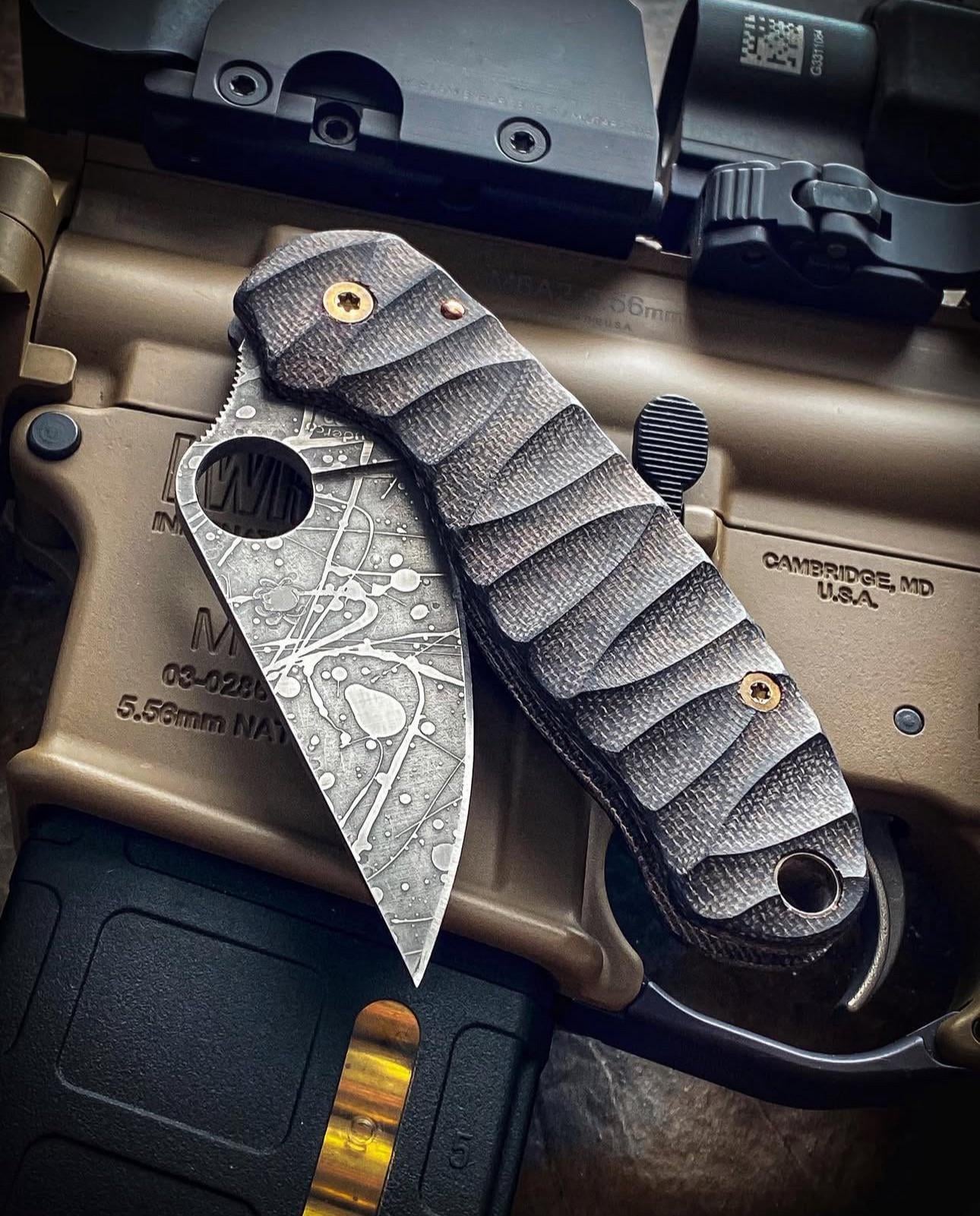 Spyderco Para3 mod with black canvas micarta scales by Suingab, flame bronzed hardware, and 2-stage acid etch. Sold a few years back, I miss it so much…