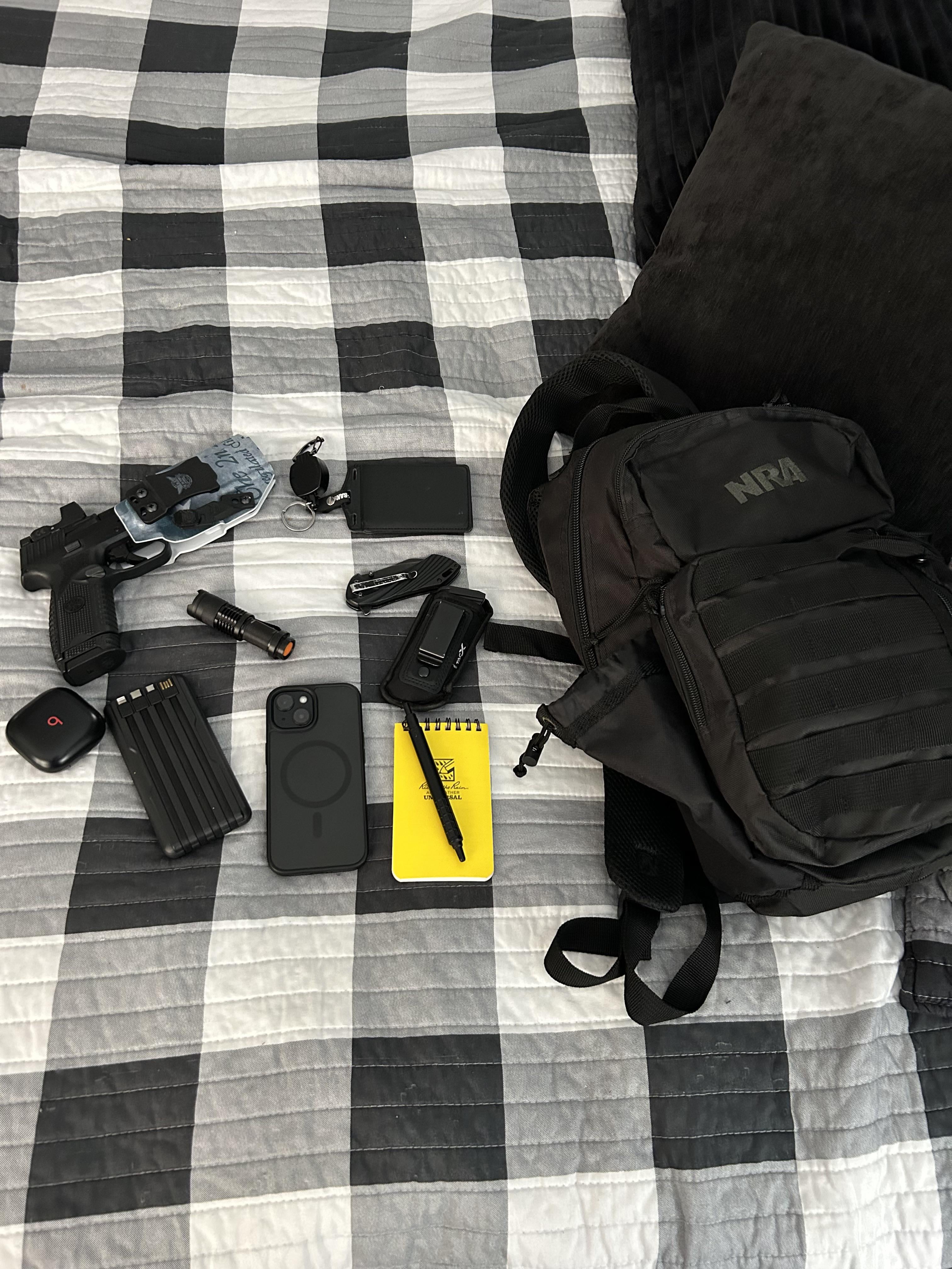 My everyday carry consists of my FN509 Tactical, IWB We the people holster, iPhone 15, spare mag in universal holder, cheap flashlight, beats fit pro, universal battery charger, small backpack, write in the rain pad, and tactical zebra pen, ID badge.