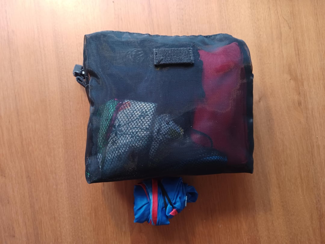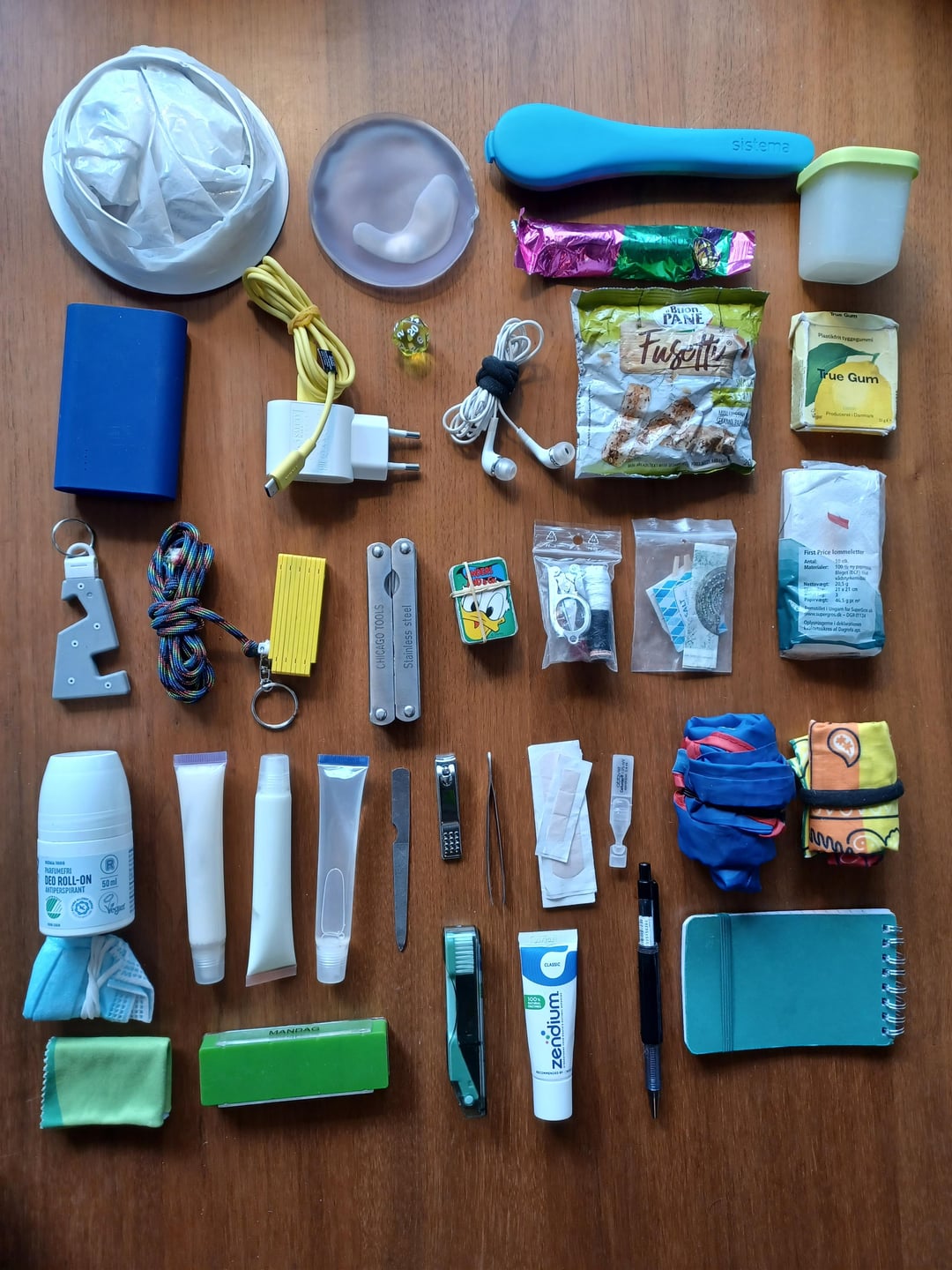 My monthly reorganisation of the 18 cm x 20 cm pouch I always carry my backpack. I get immense satisfaction out of being prepared for almost everything.