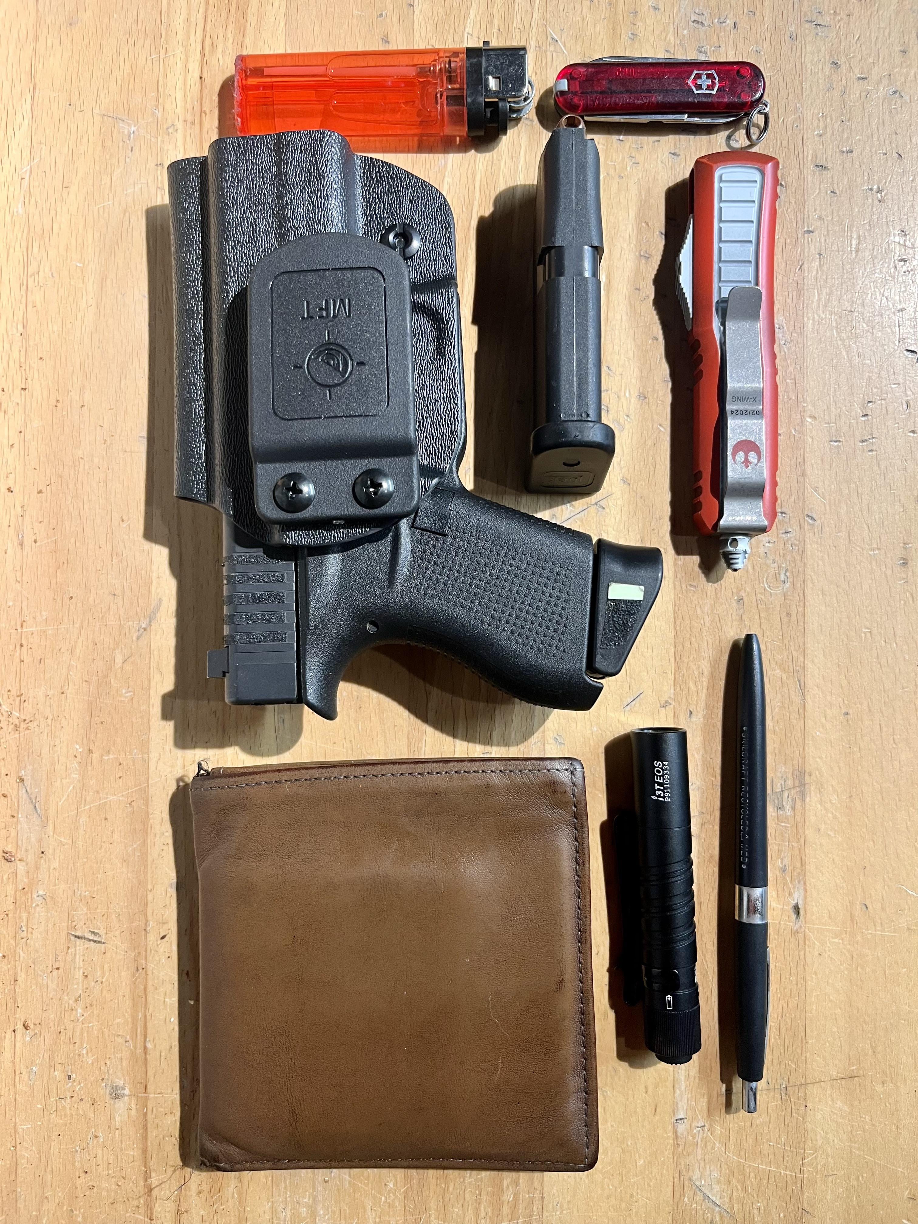 In EDC Pocket dump while in the shop February 15, 2026 Amity cowhide wallet, Glock 42 w extra mag, olight, microtech OTF, Swiss mini, bic, skillcraft pen by JackUltraRuby EDC Prev Post Sunday carry February 15, 2026 Next Post My edc (I’m a high plains cowboy from 1865) February 15, 2026 Related Posts arrived yesterday) February 15, 2026 58/M Truck Driver – parked for the day February 15, 2026 EDC as a Custodian M21 February 15, 2026 1 Comment AutoModerator 3 hours ago Thank you for posting to r/EDC! Include a detailed item list (make/model) within **1 hour** of submission. Lists can go in the title, a comment, or the image. Posts without lists will be removed. If you have already provided a list, not further action is needed, thanks | [FAQ](https://www.reddit.com/r/EDC/wiki/faq)*I am a bot, and this action was performed automatically. Please [contact the moderators of this subreddit](/message/compose/?to=/r/EDC) if you have any questions or concerns.*Write A CommentYou must be logged in to post a comment.