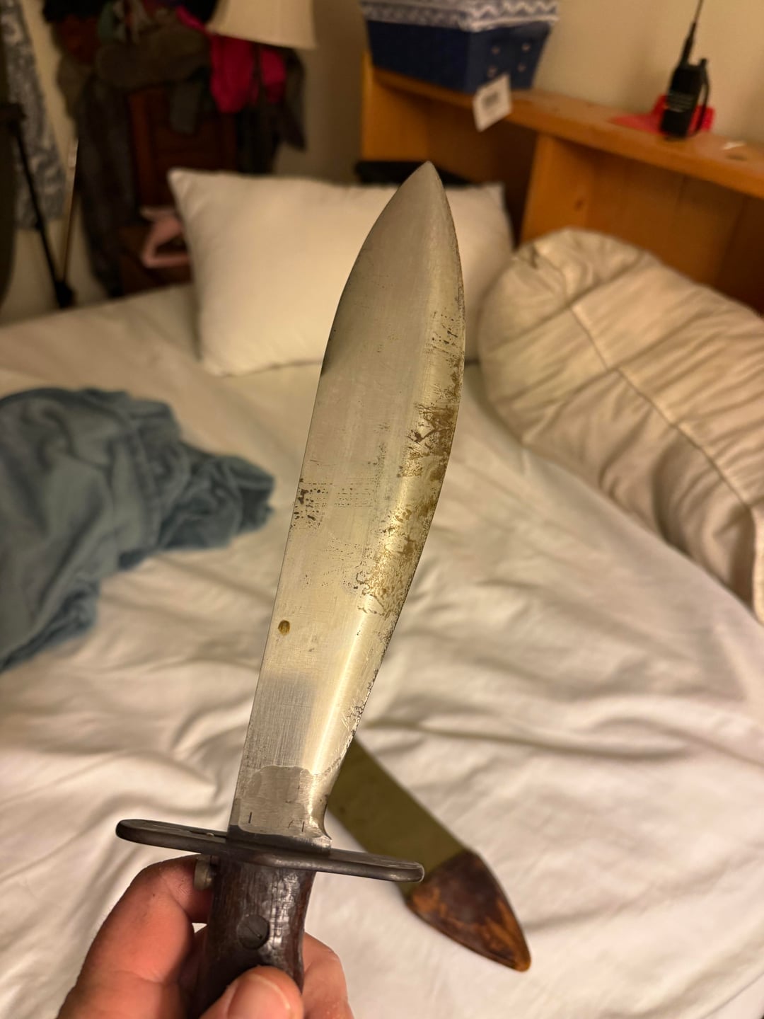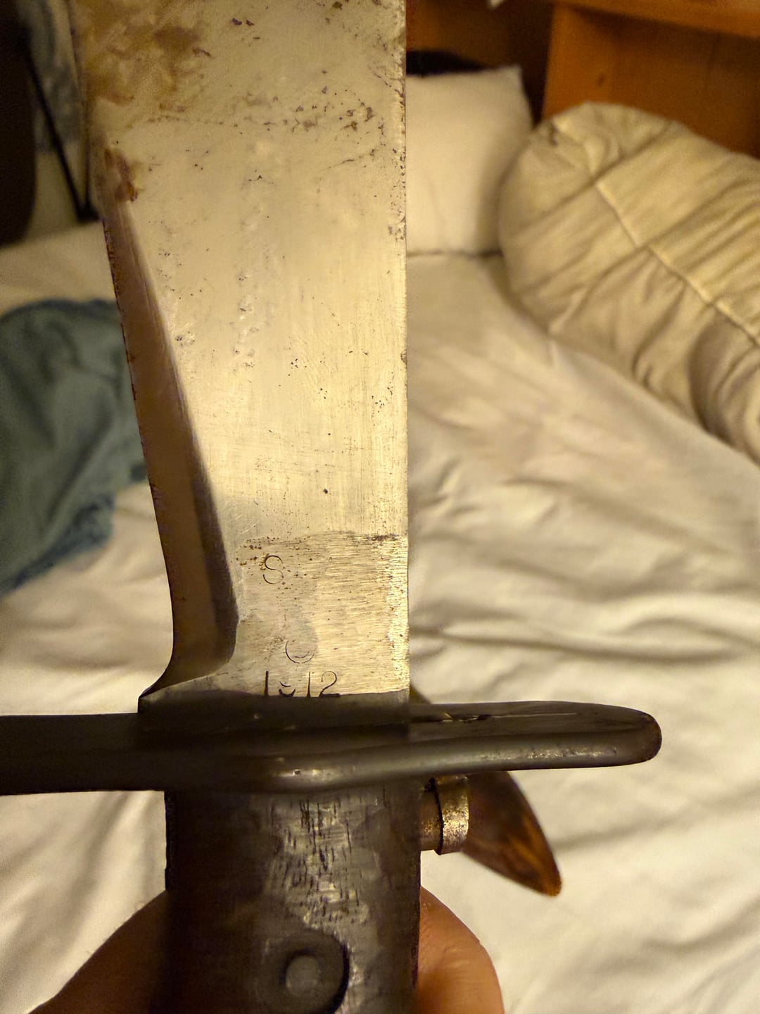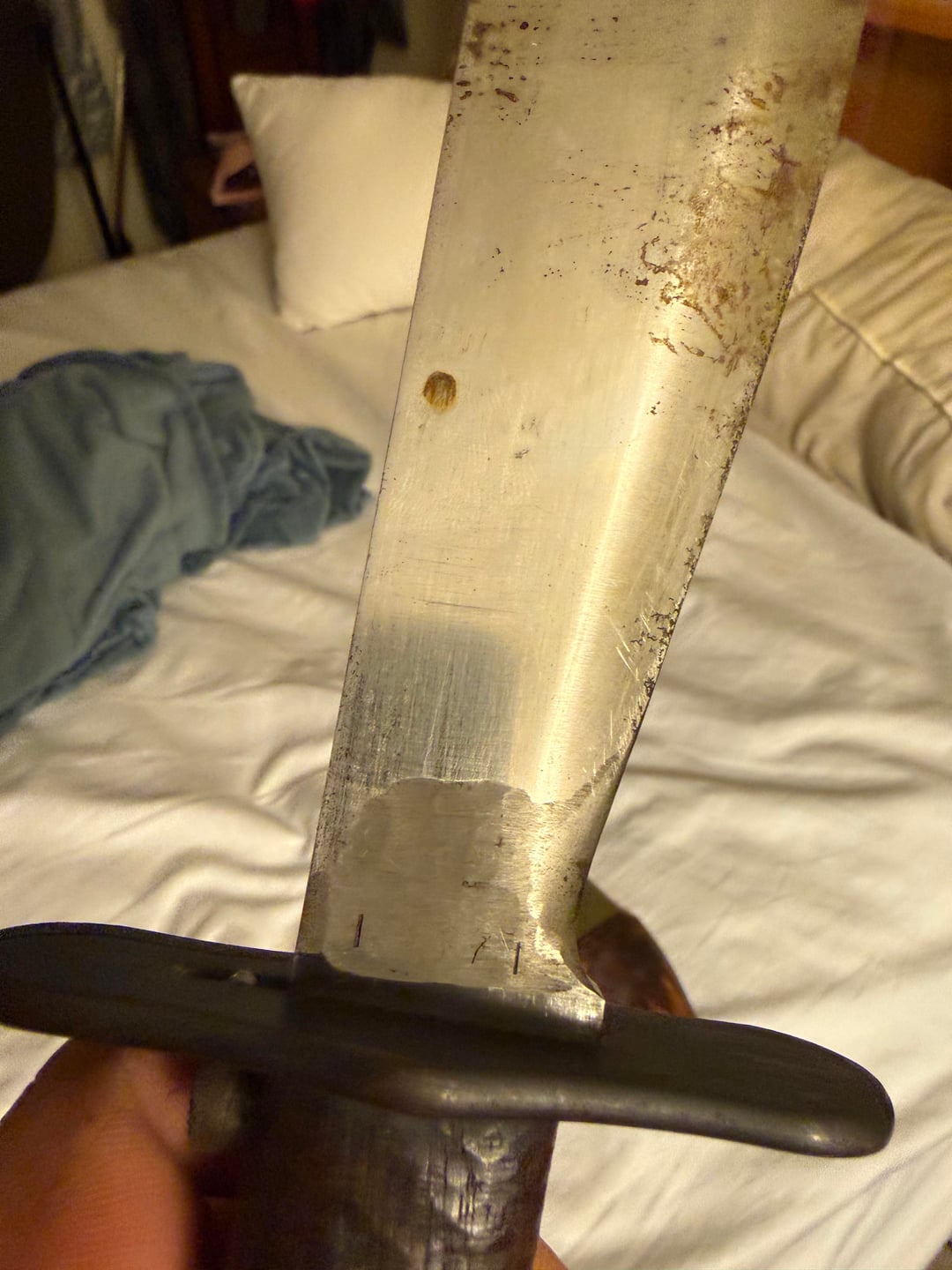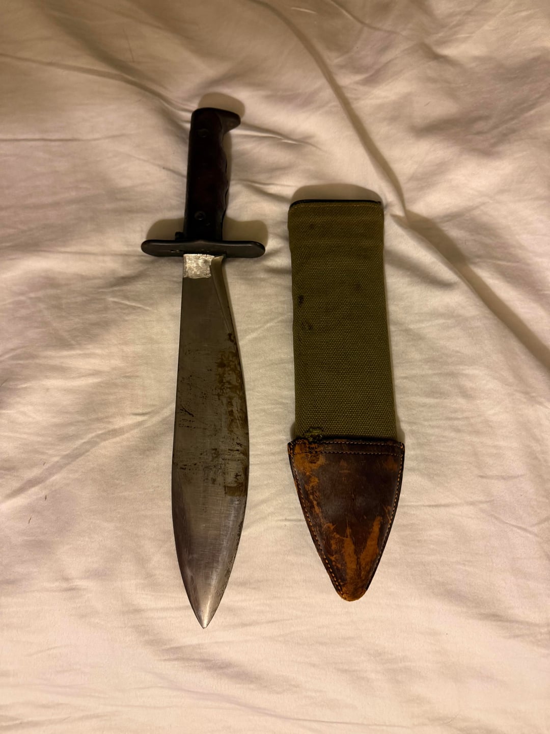 Found this old bolo knife in a work truck under the seat. No one knew anything about it so I got to take it home. I’m not sure why the date a serial number is filed off. You can barely make it out. Still a pretty cool knife. If anyone knows the worth of this knife that would be great to know. Not sure if that blood on the blade or just rust.
