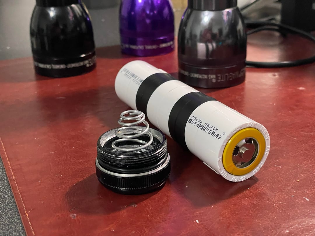 Anyway, I made a battery adapter using a few PVC pipe segments and taping it together. Then I did the shorty-tail spring mod by sanding away some anodization in the tailcap. Modding the switch assembly is really easy. The nice thing about this set up is that even though the bulb is LED, because it’s meant for A/C power it doesn’t matter which lead it wired to positive or negative.