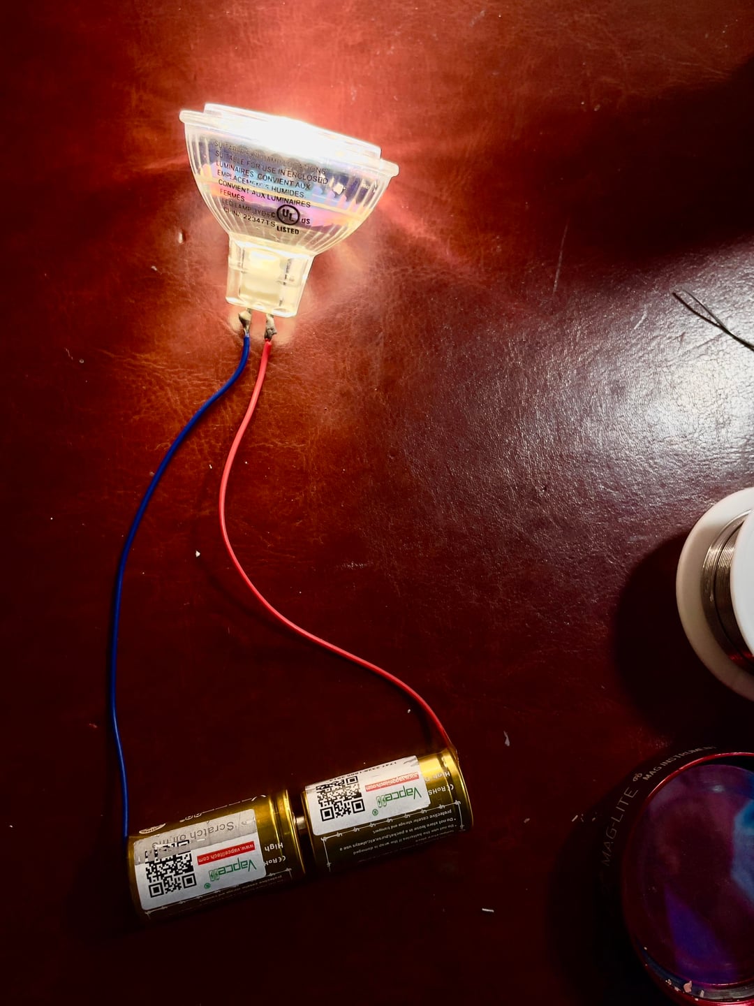 From there I bought some cheap, well reviewed MR16 sockets and some 26650s rated at 5000mAh. I figure that this could get me about 5h of run time but I haven’t tested that yet. And also, chances are I’ll mostly just keep this as a fun project piece or to show off to any friends who are curious. I thought about maybe running it on 1 Li-Ion cell using a boost driver to kick it up to 9V or 12V but that felt like I’d be thinning out the soup a bit much driving a driver with a driver….