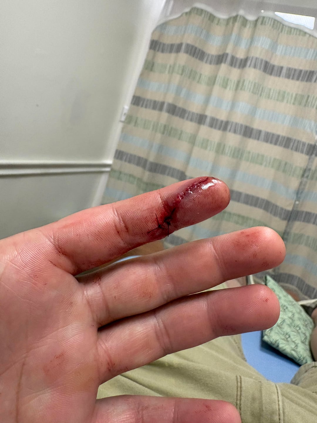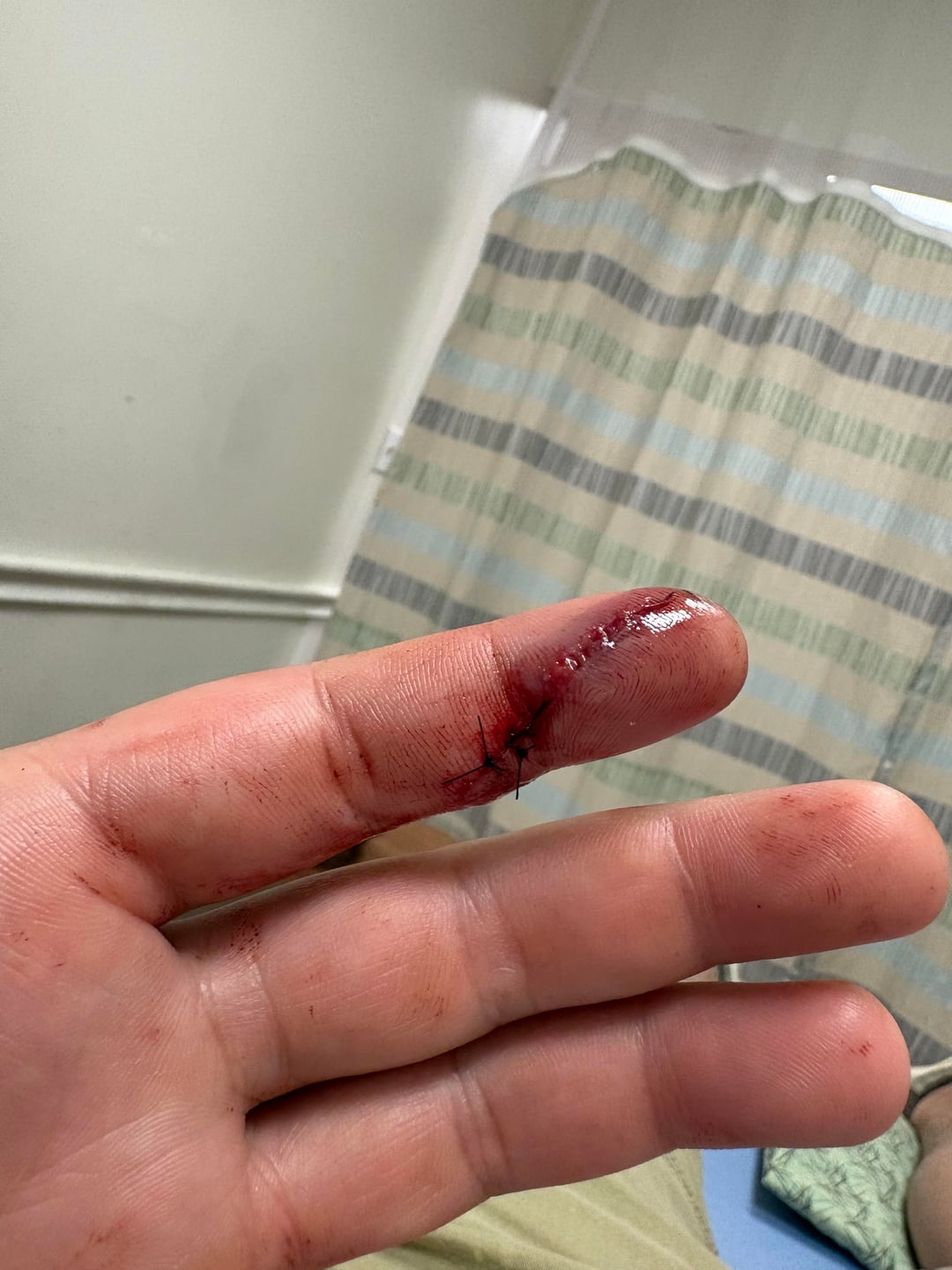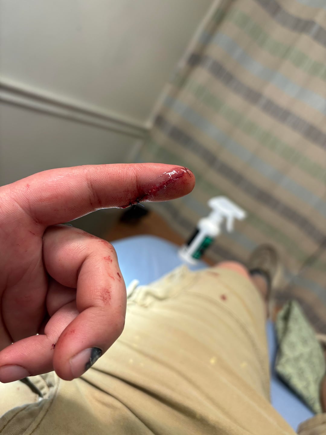 I’ve had some pretty bad cuts but this one went so deep and my finger instantly went numb so I knew it was way worse than any of the others. It went to the bone and just poured blood because I actually cut the radial artery of the index finger so I got to see blood pulse out of it and even squirt out a little like in the movies. I bled for a total of 5 hours waiting for the ER to fix me. It would’ve been all super glue but she didn’t think the super glue would fully stop the artery from bleeding so she did 3 stitches to stop the bleeding and the rest super glue.
