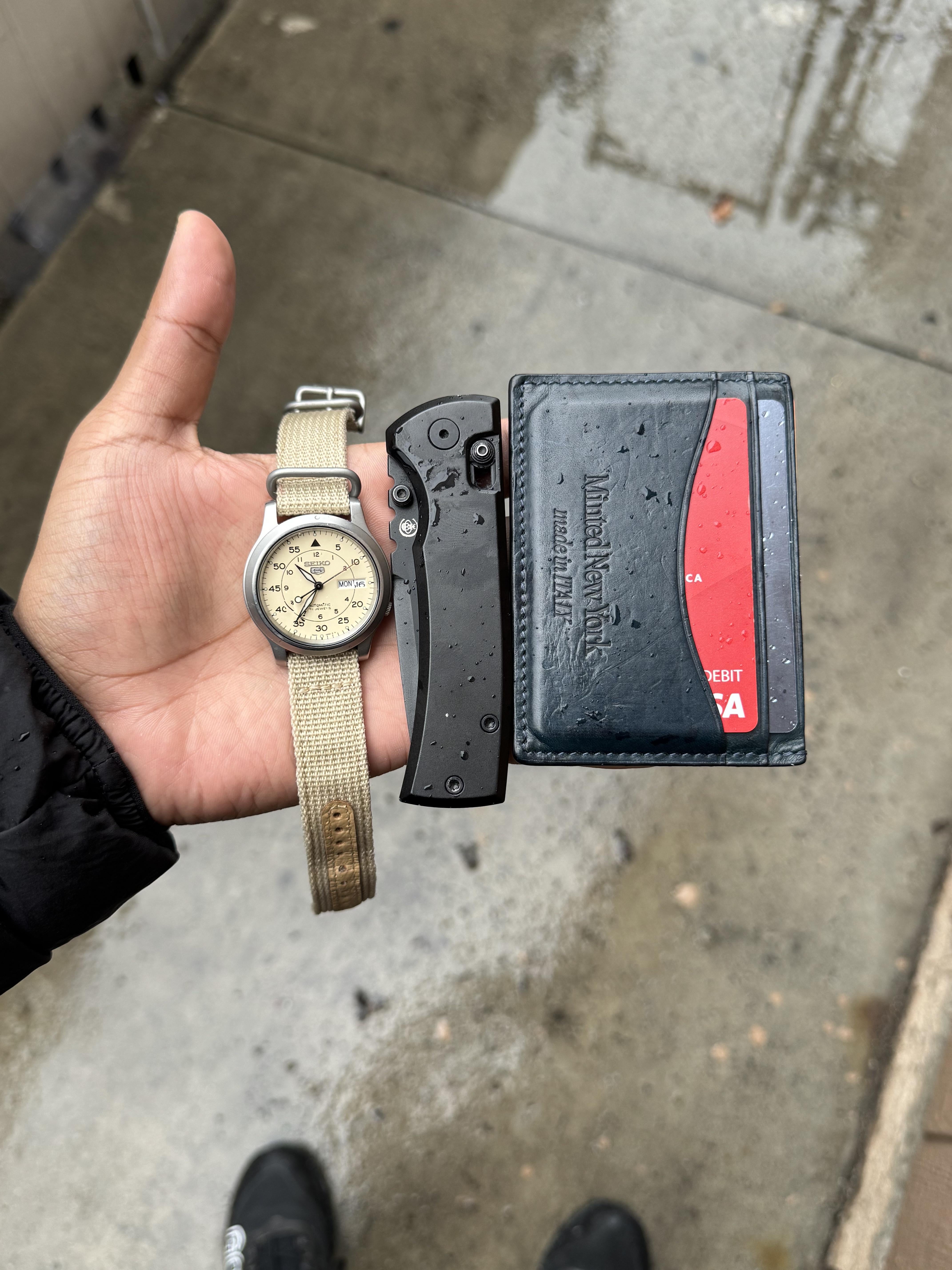 In EDC Monday rain carry February 16, 2026 Seiko snk803 Chaves knifes Minted New York wallet by Matt180x EDC Prev Post My collection February 16, 2026 Next Post Mardi Gras Day Carry 42m Photographer February 16, 2026 Related Posts The perfect carry (for me) April 24, 2026 EDC for the ManyBaggers April 23, 2026 Wednesday Night Off April 23, 2026 1 Comment AutoModerator 2 months ago Thank you for posting to r/EDC! Include a detailed item list (make/model) within **1 hour** of submission. Lists can go in the title, a comment, or the image. Posts without lists will be removed. If you have already provided a list, not further action is needed, thanks! [Rules](https://www.reddit.com/r/EDC/wiki/rules) | [FAQ](https://www.reddit.com/r/EDC/wiki/faq) *I am a bot, and this action was performed automatically. Please [contact the moderators of this subreddit](/message/compose/?to=/r/EDC) if you have any questions or concerns.* Write A CommentYou must be logged in to post a comment.