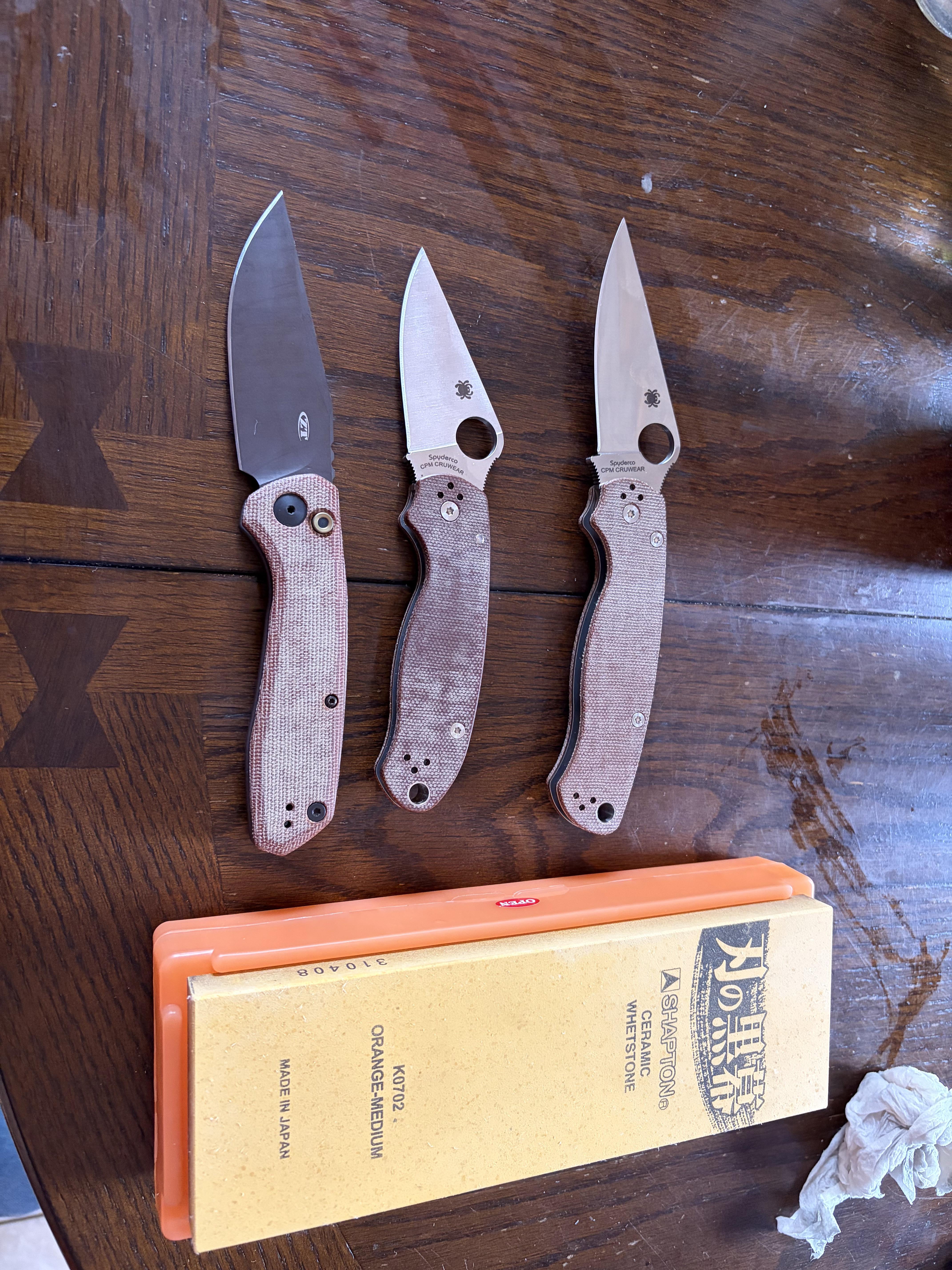 I swear to you these are the 3 knives I use the most and I love them all. I just sat down for some maintenance on them and when I was packing up I noticed the are all canvas micarta and cpm cruwear blades. I mean I knew that about all 3 but it never clicked for me that my 3 favorite EDCs are all the same materials in both scales and blades.