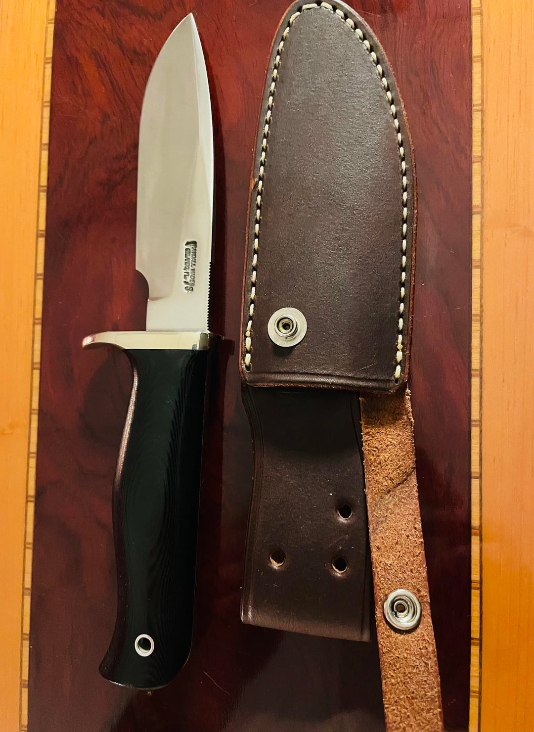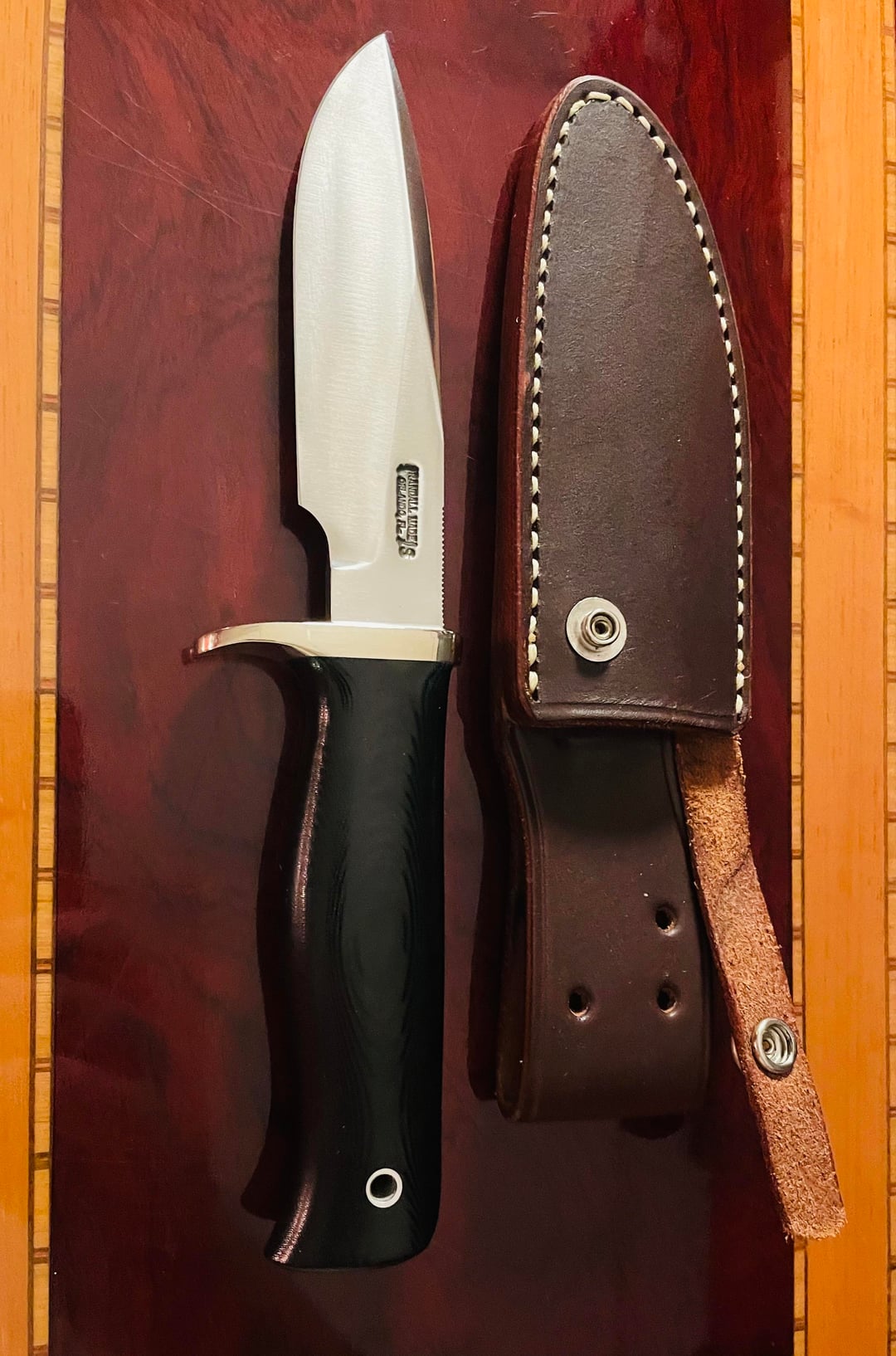 Here, it’s in black micarta with a silver-nickel alloy guard.