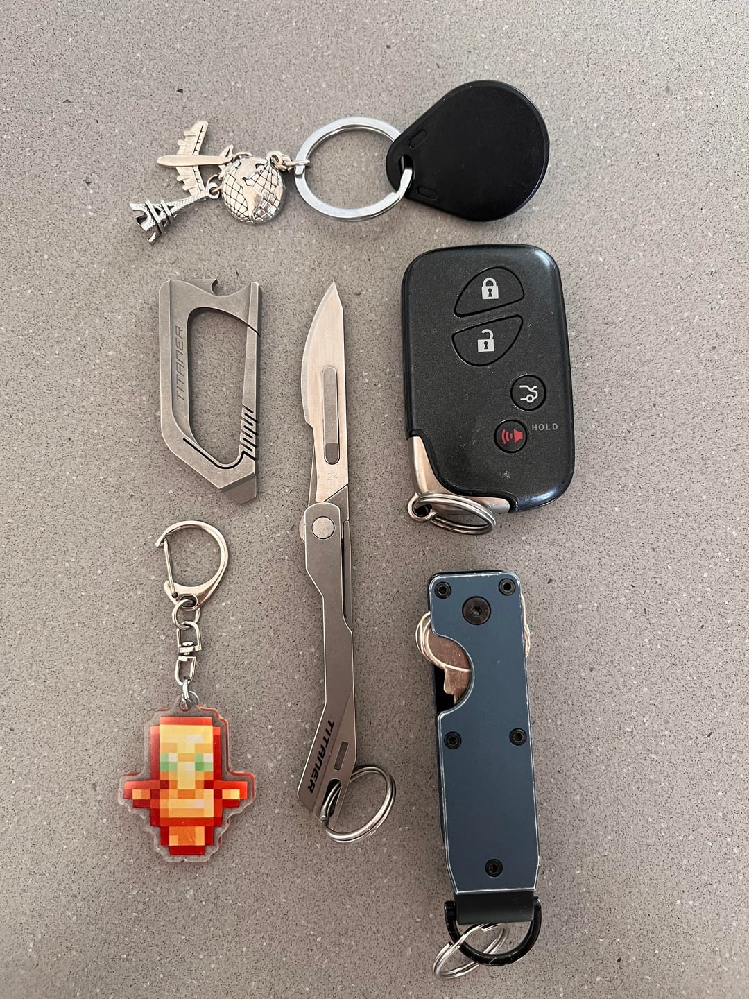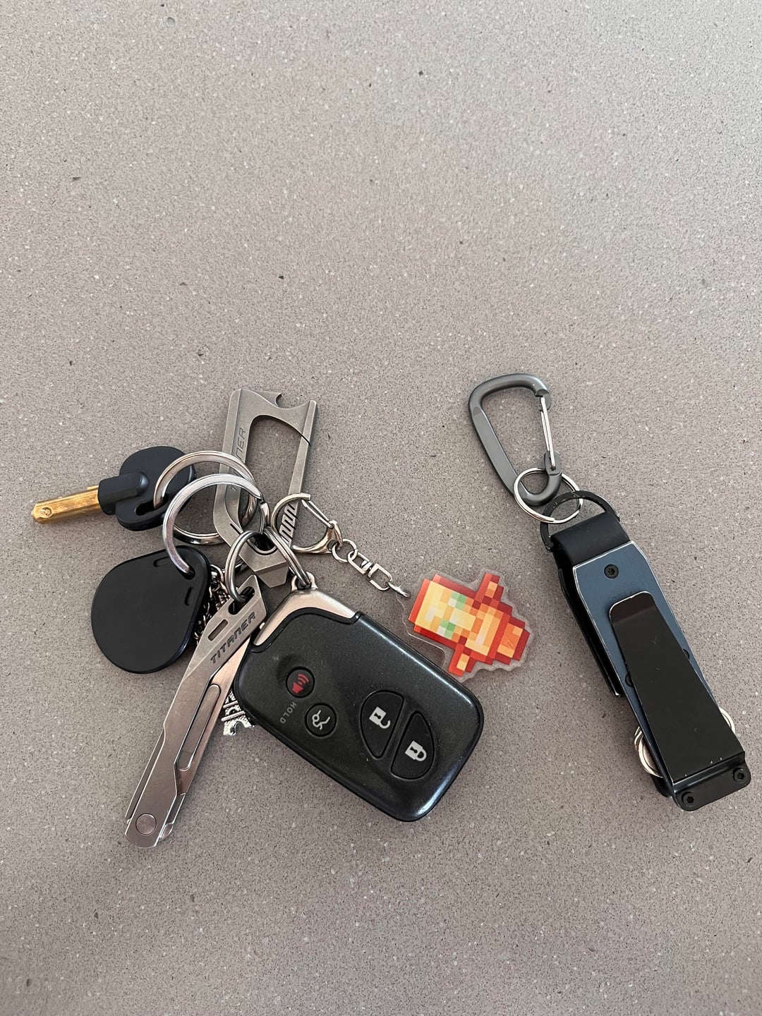 Titaner carabiner with a flathead driver/pry tool (surprisingly useful as a person who lacks long nails) and a bottle opener.