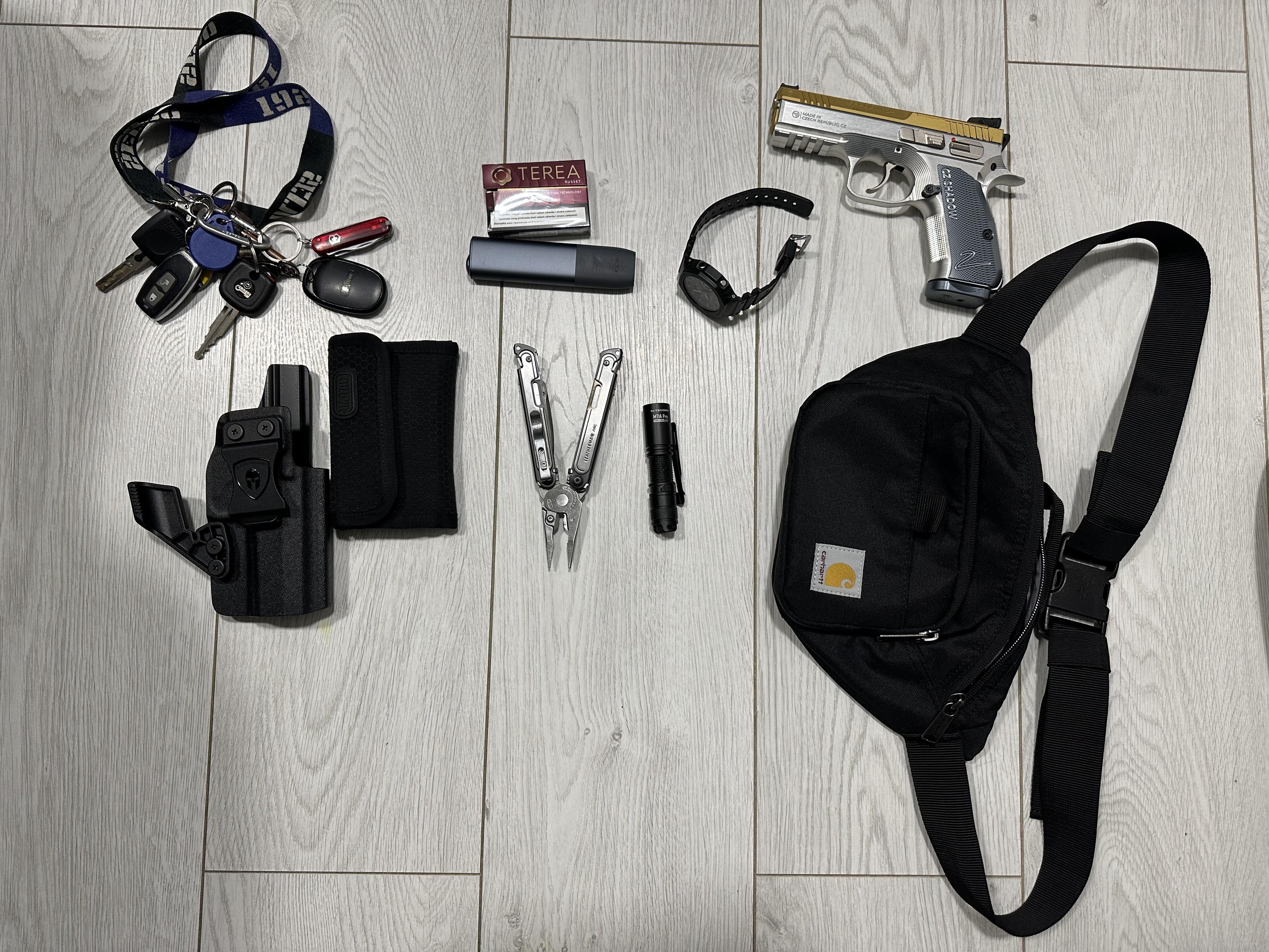 keys with mini victorinox, iqos terea, g shock casioak solar( i rotate my watches but this one is most worn), cz shadow 2 compact industrial gold, warriorland kydex holster( i rotate my holster or waist bag depends on my mood), m tac cordura wallet, leatherman arc, nitecore mt1a pro, carrharr water reppelent waist bag( i have a few more but this is the only one that can handle the gun) properly)