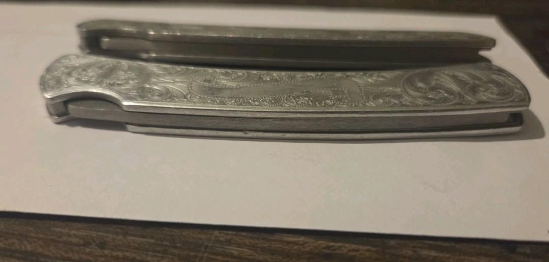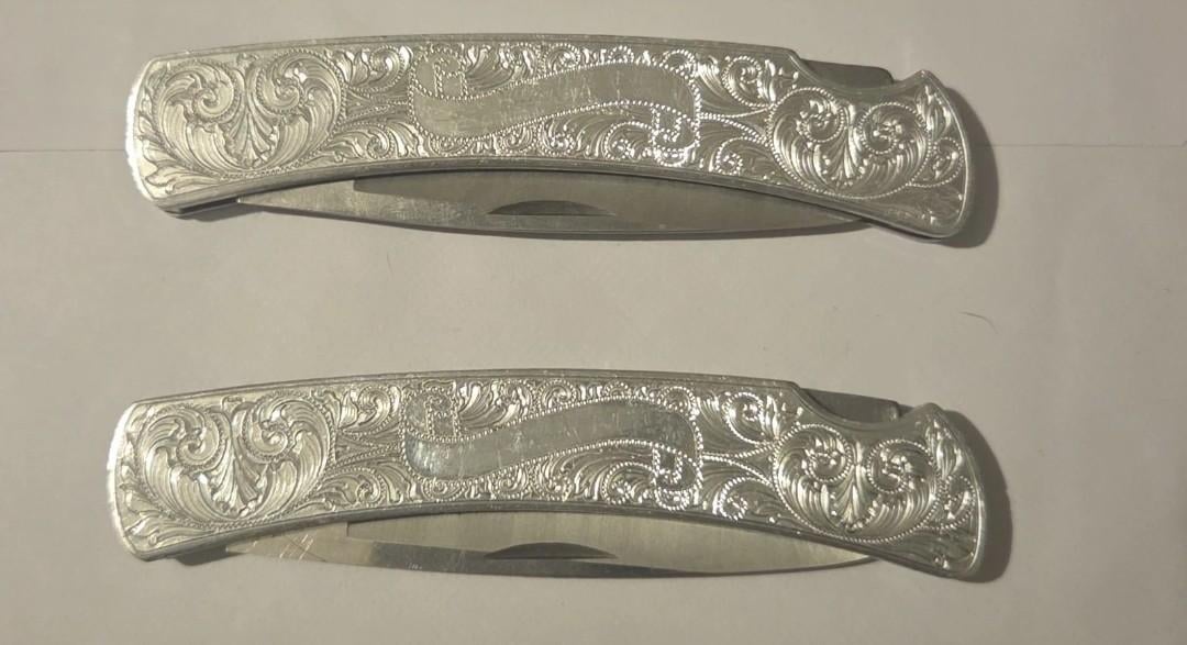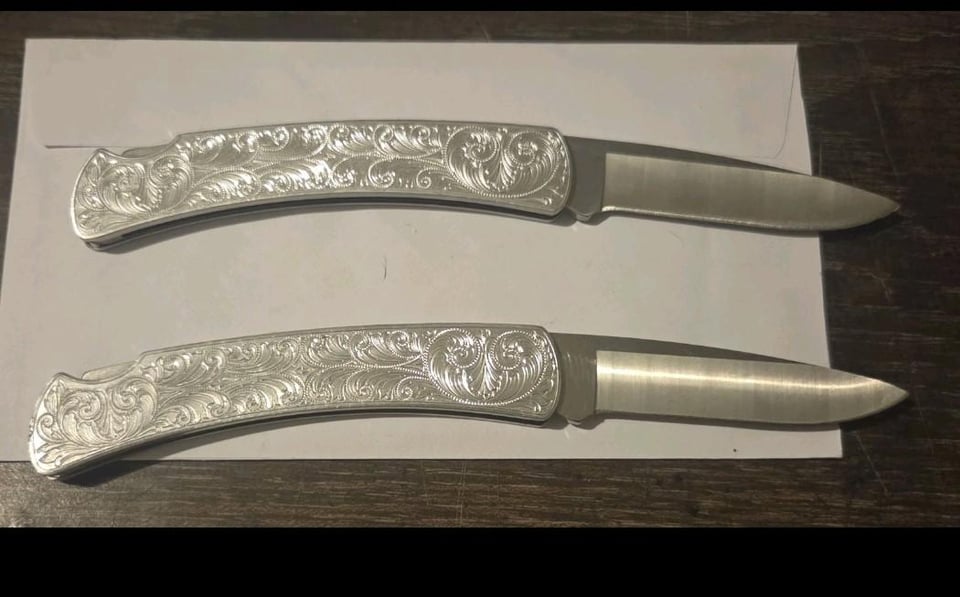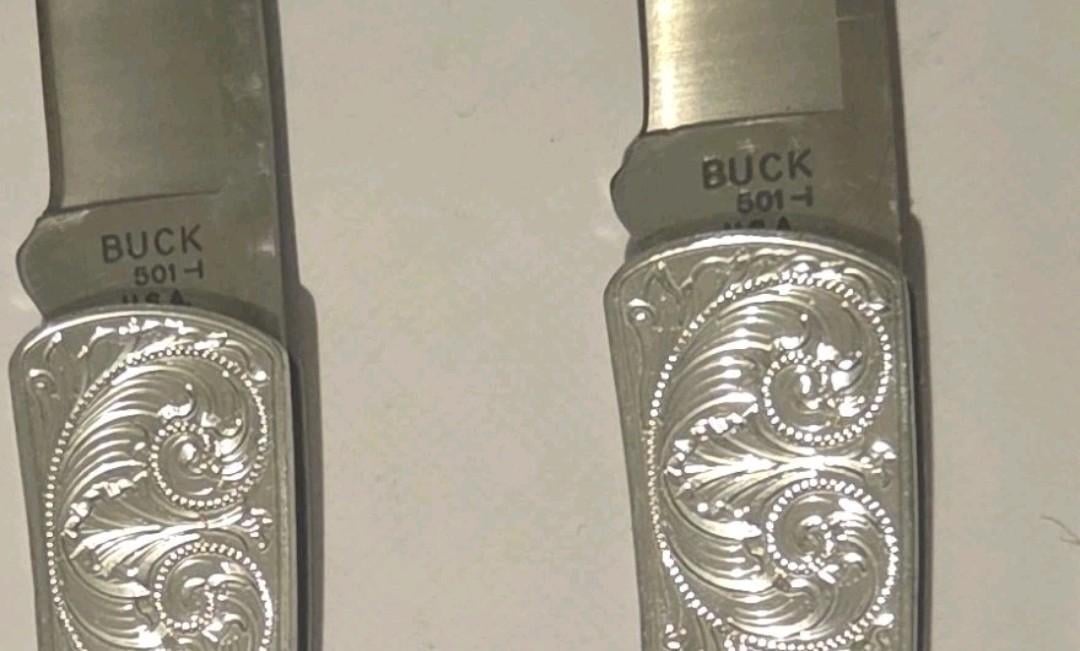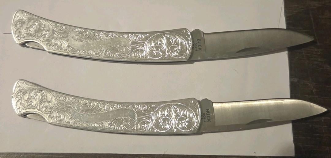 rare, matched pair of 1987 Buck 501 Squire folding knives. These are not standard production models; they feature the highly desirable Aurum Etchings deep-scroll pattern on polished nickel silver bolsters.Year of Manufacture: 1987 (Confirmed by the sideways "T" (\vdash) date code).