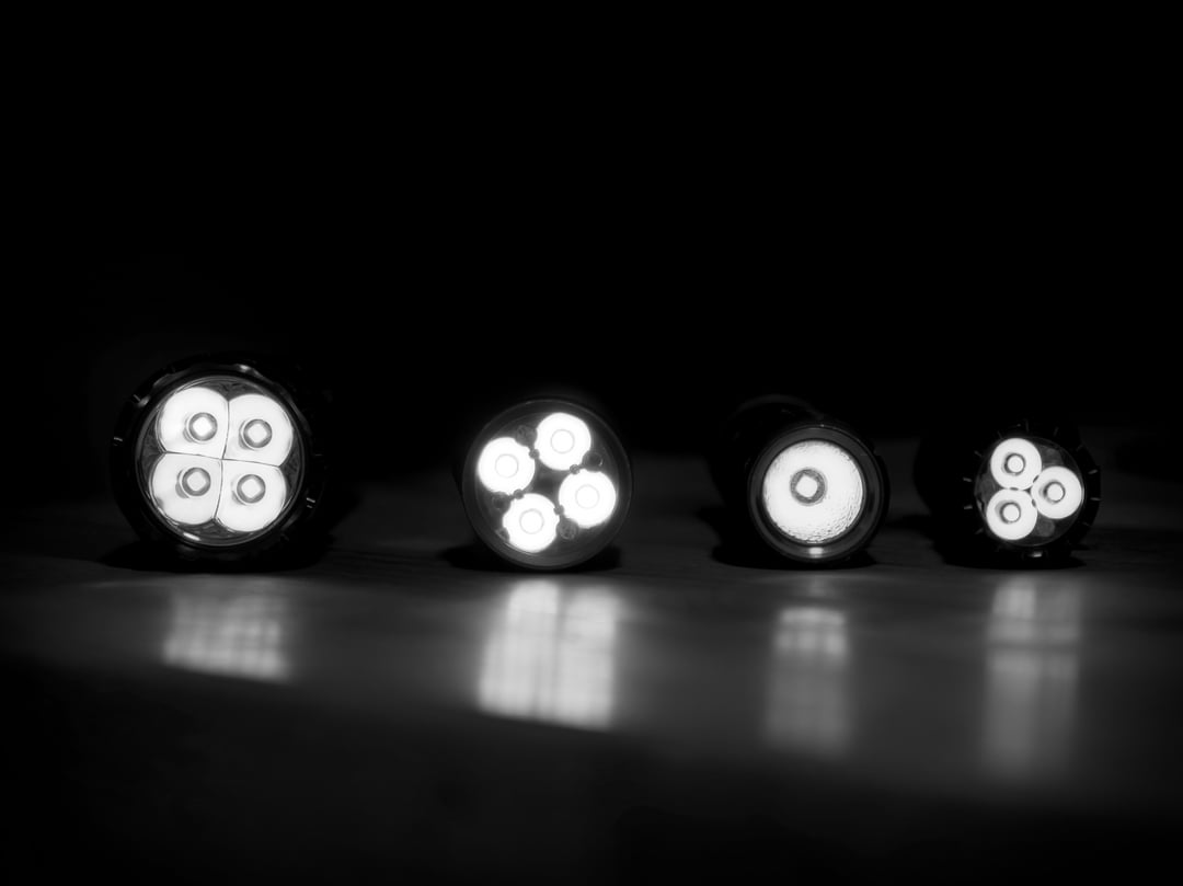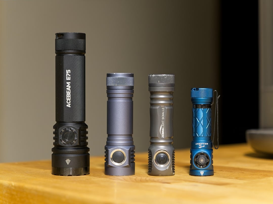 Lights from left to right: Acebeam E75 Nichia 519A variant, Emisar D4 (OG) with 5000k XPL HI, Zebralight SC64c LE, and the Skilhunt EC150 Nichia 519A variant