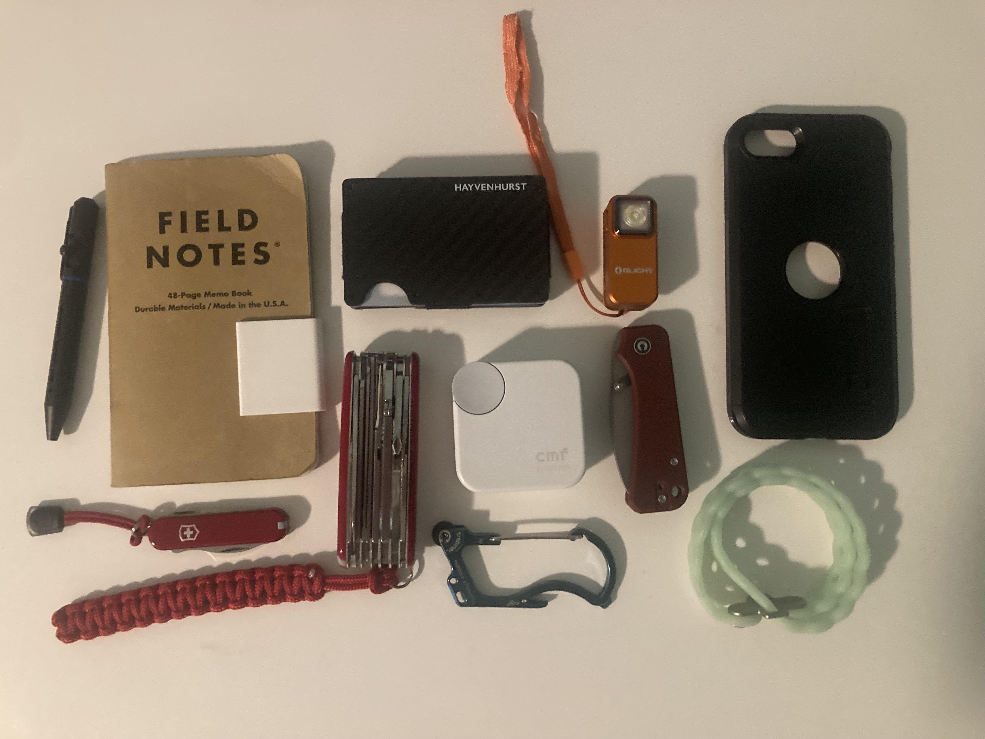 Ordinary-Manager7530 3 hours ago * **Pen:** Olight O’Pen Mini 2 * **Notebook:** Field Notes 3.5×5.5 Lined * **Keychain multitool:** Victorinox Jetsetter * **Main multitool:** Victorinox SwissChamp * **Wallet:** Hayvenhurst Wallet * **Earbuds:** CMF Buds 2a * **Carabiner:** Outdoor Element Firebiner * **Flashlight:** Olight Oclip * **Knife:** Civivi Baby Banter * **Bracelet:** MODL Infinity Tool * **Phone:** iPhone SE Gen 2