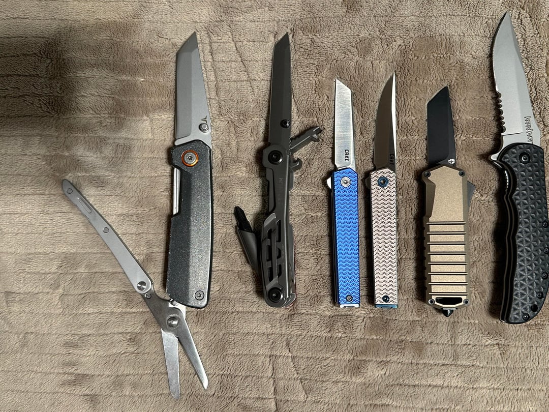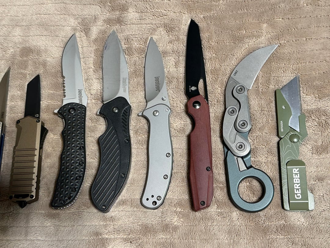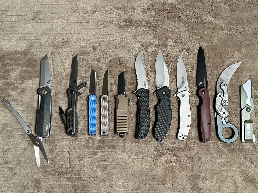 From left to right: True Dual Cutter, True Ti 5 in 1, CRKT CEO Microflipper (x2), Tekto A2 Badger, Kershaw Volt 2, Clash and Zing SS, Kizer Genie, CRKT Provoke Karambit, Gerber E.A.B (missing its Lennox Gold blade… sad). Oh and the forgotten Opinel I was gifted in last picture, not my choice of color but still dig it.