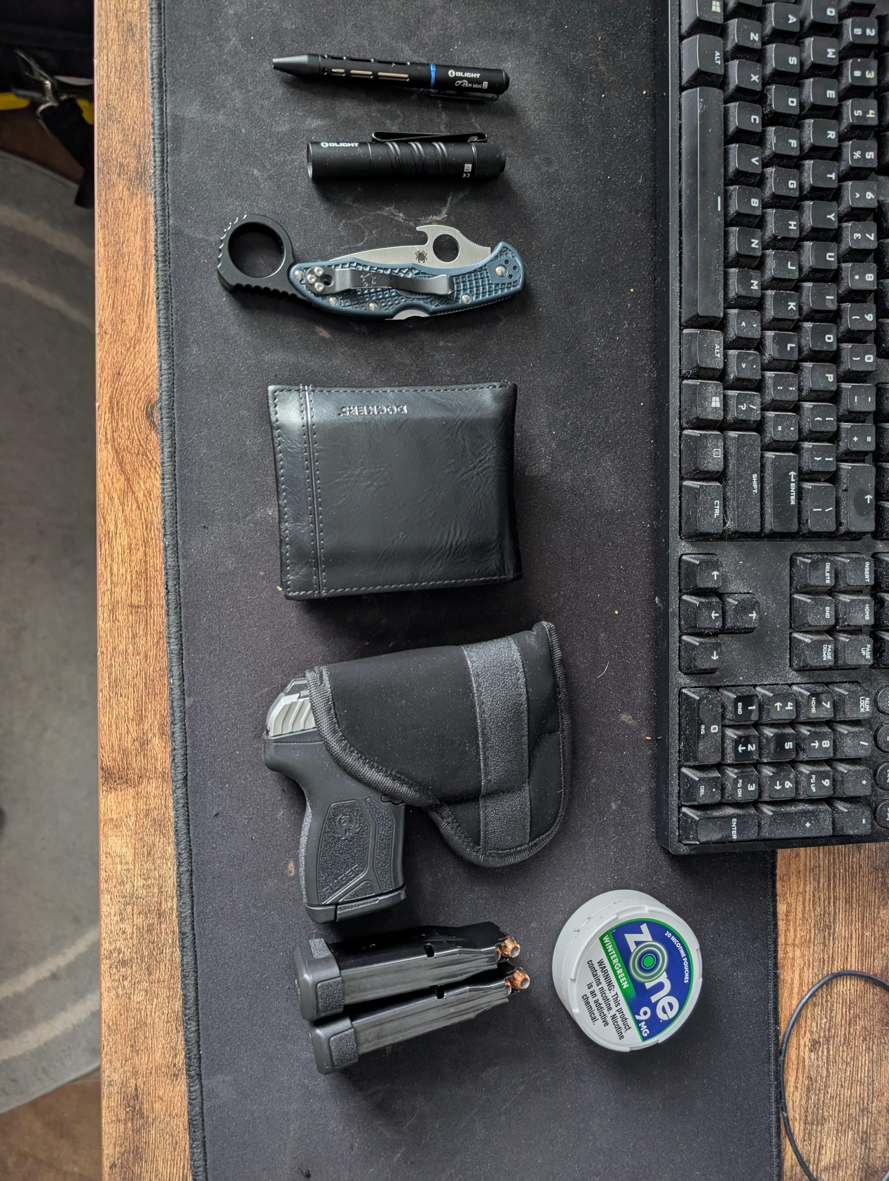 In EDC Pocket dump February 18, 2026 Olight pen, Olight i3T2EOS, Spyderco delica 4 Emerson, generic wallet, Ruger LCP Max two spare mags and nicotine pouches.by tshort_504 EDC Prev Post Cold night walks February 18, 2026 Next Post Sebenza 31 Action February 18, 2026 Related Posts Wednesday carry February 18, 2026 Cutty EDC February 18, 2026 Never forget your IFAK. February 18, 2026 1 Comment AutoModerator 3 hours ago Thank you for posting to r/EDC! Include a detailed item list (make/model) within **1 hour** of submission. Lists can go in the title, a comment, or the image. Posts without lists will be removed. If you have already provided a list, not further action is needed, thanks | [FAQ](https://www.reddit.com/r/EDC/wiki/faq)*I am a bot, and this action was performed automatically. Please [contact the moderators of this subreddit](/message/compose/?to=/r/EDC) if you have any questions or concerns.*Write A CommentYou must be logged in to post a comment.