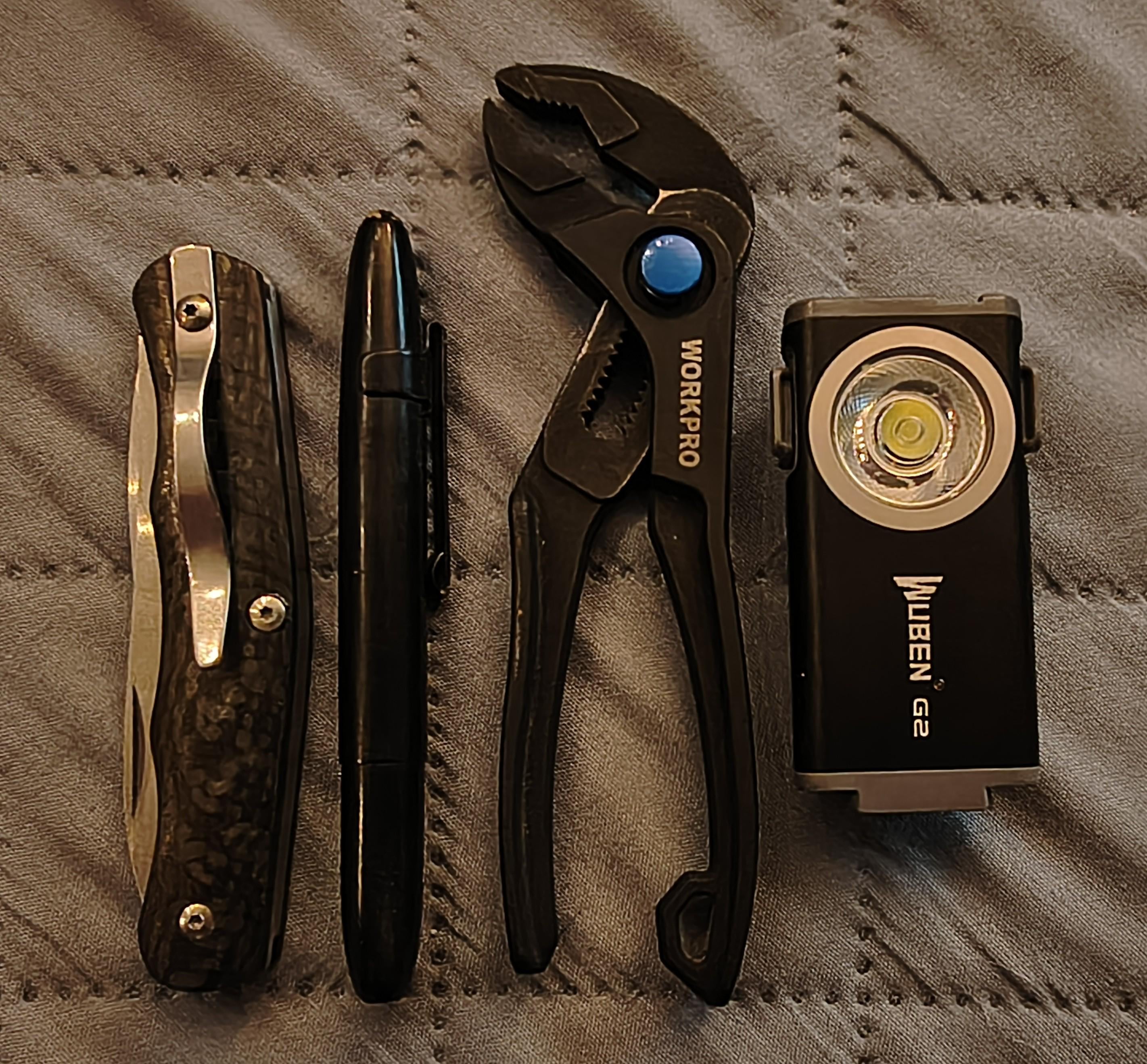 In EDC One pocket tiny edc February 19, 2026 CS Lucky 2 (CPM S35VN) Fisher bullet Workpro 4" waterpump pliers Wuben G2 (Technically the pliers ride in fifth pocket next to a bic, but…)by ad_duncan EDC Prev Post NKD – Les George VECP February 19, 2026 Next Post I have this 30 year old Gerber February 19, 2026 Related Posts Finally perfected the auto-feeding mechanism. My patented CNC slingshot build disassembled. April 10, 2026 Pic your favorite April 10, 2026 Seigaiha collection pt 2🌊🌊 April 10, 2026 1 Comment AutoModerator 2 months ago Thank you for posting to r/EDC! Include a detailed item list (make/model) within **1 hour** of submission. Lists can go in the title, a comment, or the image. Posts without lists will be removed. If you have already provided a list, not further action is needed, thanks | [FAQ](https://www.reddit.com/r/EDC/wiki/faq)*I am a bot, and this action was performed automatically. Please [contact the moderators of this subreddit](/message/compose/?to=/r/EDC) if you have any questions or concerns.*Write A CommentYou must be logged in to post a comment.