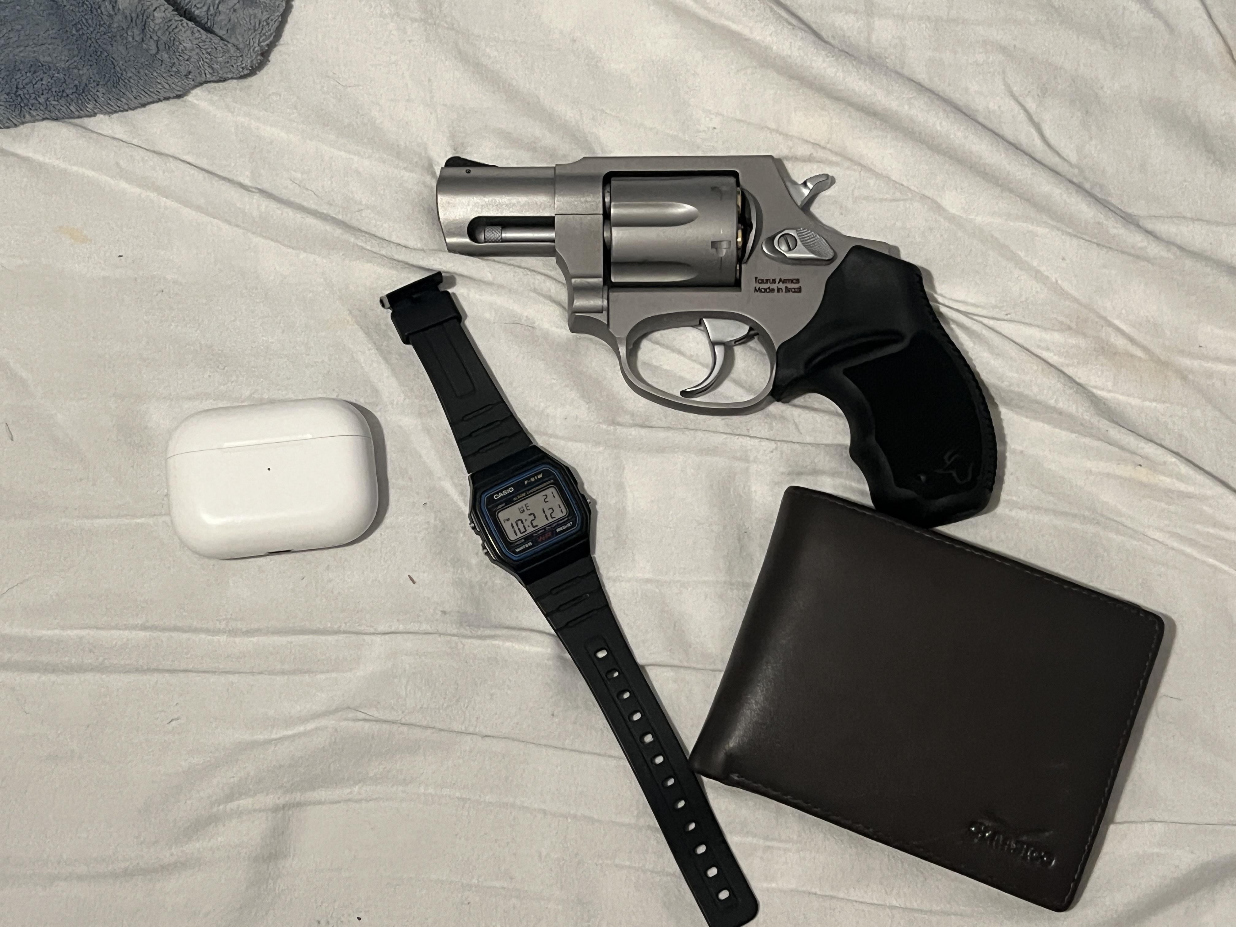 Taurus 856, my trusty airpods pros that I literally cannot live without, a casio F91 and the wallet that I begrudingly replaced my old wallet with once it started collapsing