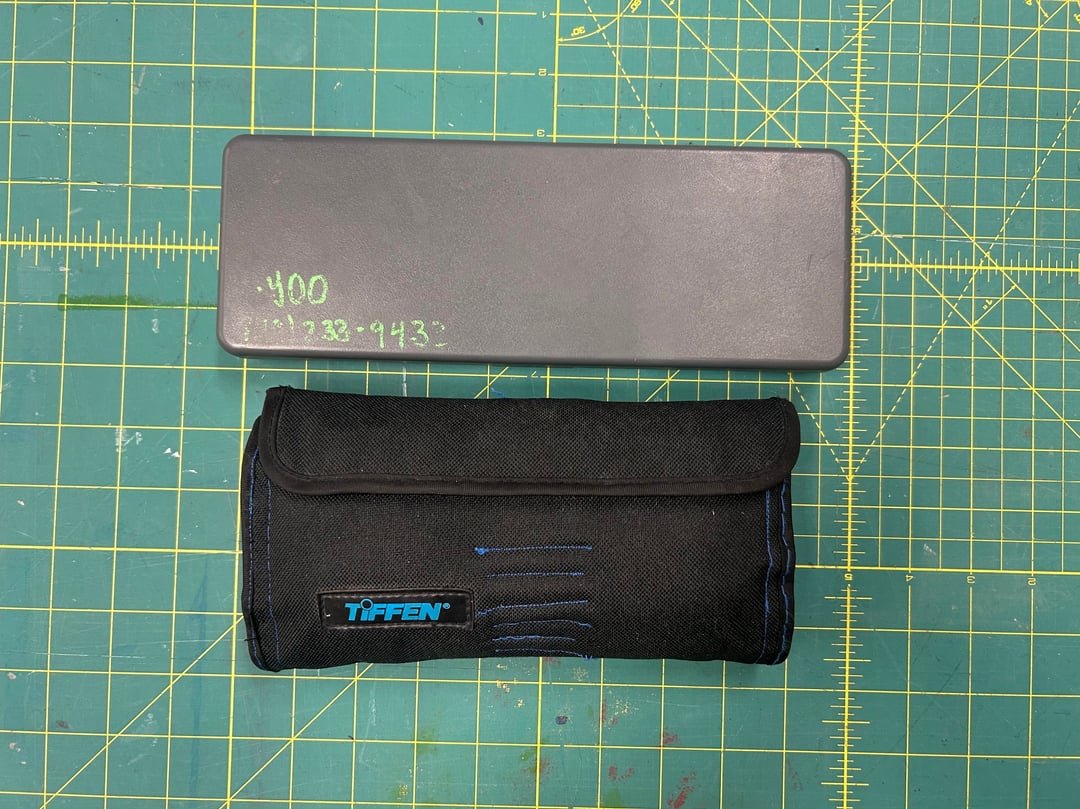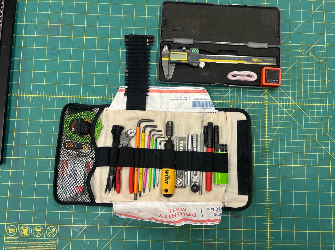 The tool roll is custom sewn from what was originally a tiffen camera filter case and when fully loaded takes up a footprint measuring 8 inches long, 4 inches wide, and 2 inches thick.