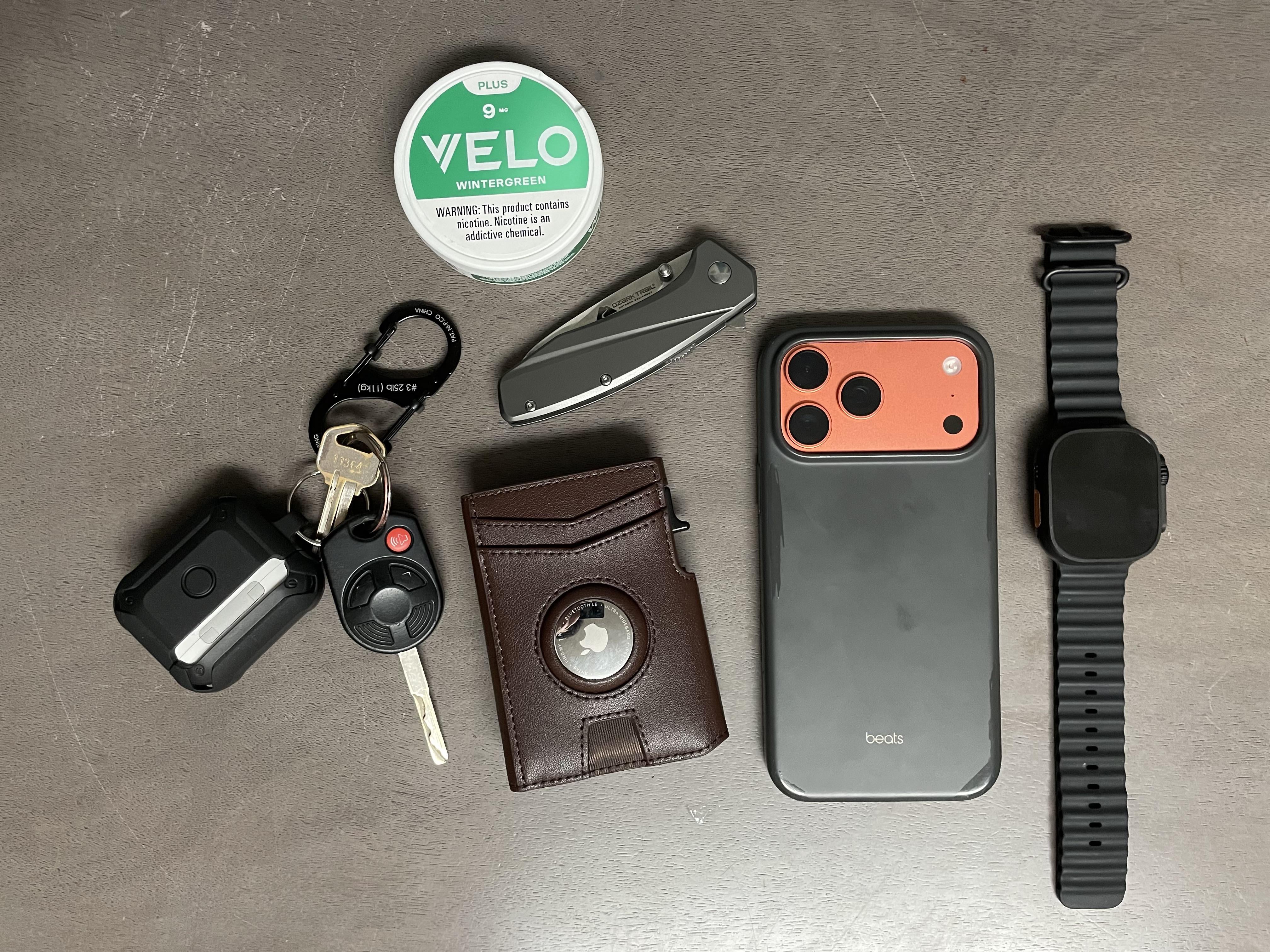 In EDC Pocket Dump, with me everyday. February 20, 2026 ~ AirPod 3rd Gen~ Velo 9mg WG~ Miyozi Wallet~ Ozark Trail Knife~ iPhone 17 Pro Max~ Apple Watch Ultra 2by Notorious-0ne EDC Prev Post My Collection February 20, 2026 Next Post Feels less than what it looks like February 20, 2026 Related Posts Feels less than what it looks like February 20, 2026 My wife calls it the “pile” February 20, 2026 Warehouse EDC February 20, 2026 1 Comment AutoModerator 2 hours ago Thank you for posting to r/EDC! Include a detailed item list (make/model) within **1 hour** of submission. Lists can go in the title, a comment, or the image. Posts without lists will be removed. If you have already provided a list, not further action is needed, thanks | [FAQ](https://www.reddit.com/r/EDC/wiki/faq)*I am a bot, and this action was performed automatically. Please [contact the moderators of this subreddit](/message/compose/?to=/r/EDC) if you have any questions or concerns.*Write A CommentYou must be logged in to post a comment.