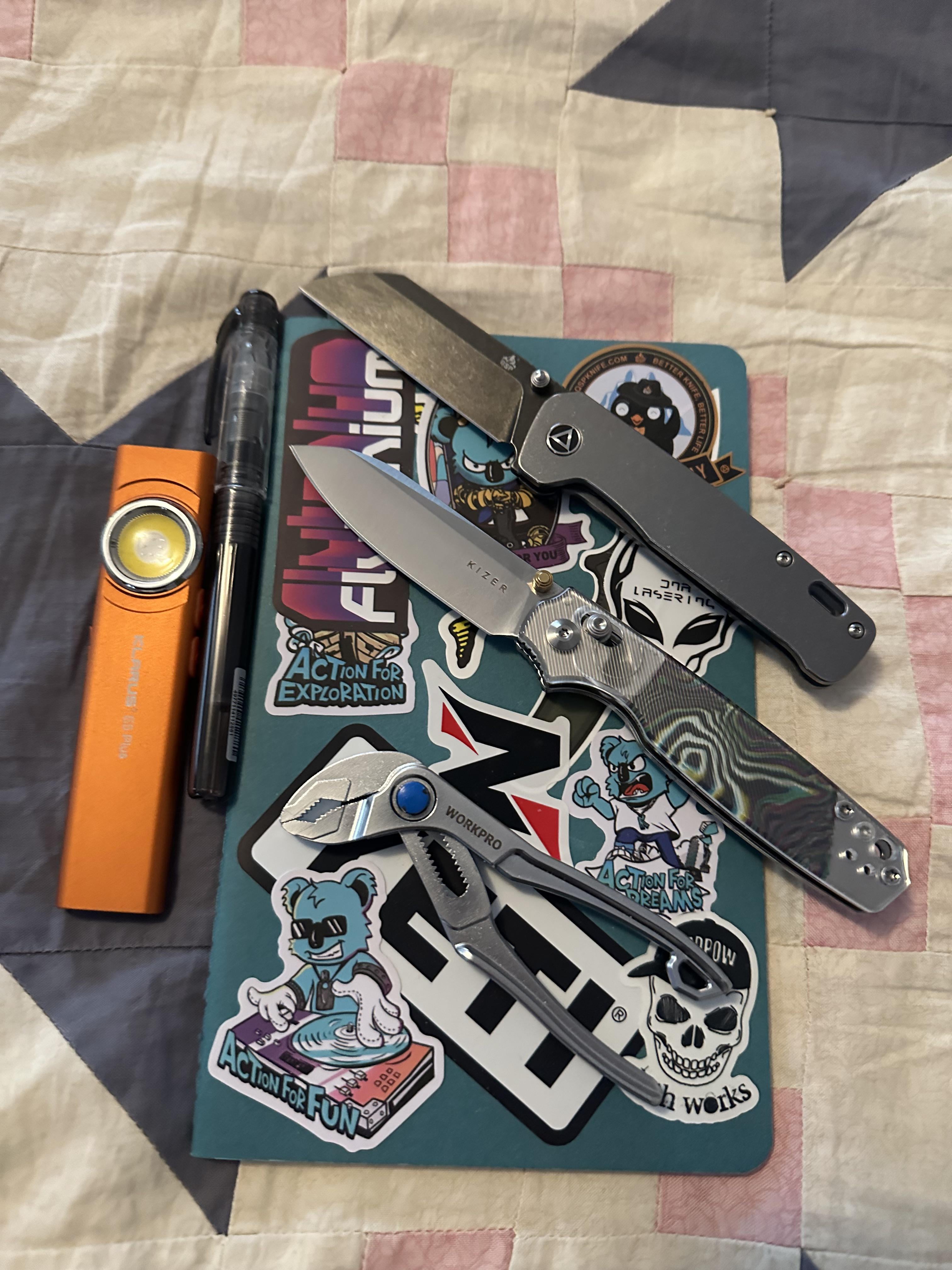 Today’s carry. Switching it up a bit the penguin and the pokiman, moleskin notebook, preppy fountain pen, klarnus light. Working like 12 hours so gonna do some work on the comic book I’m writing. Also the workpro mini plyers. I was surprised how much I use them.