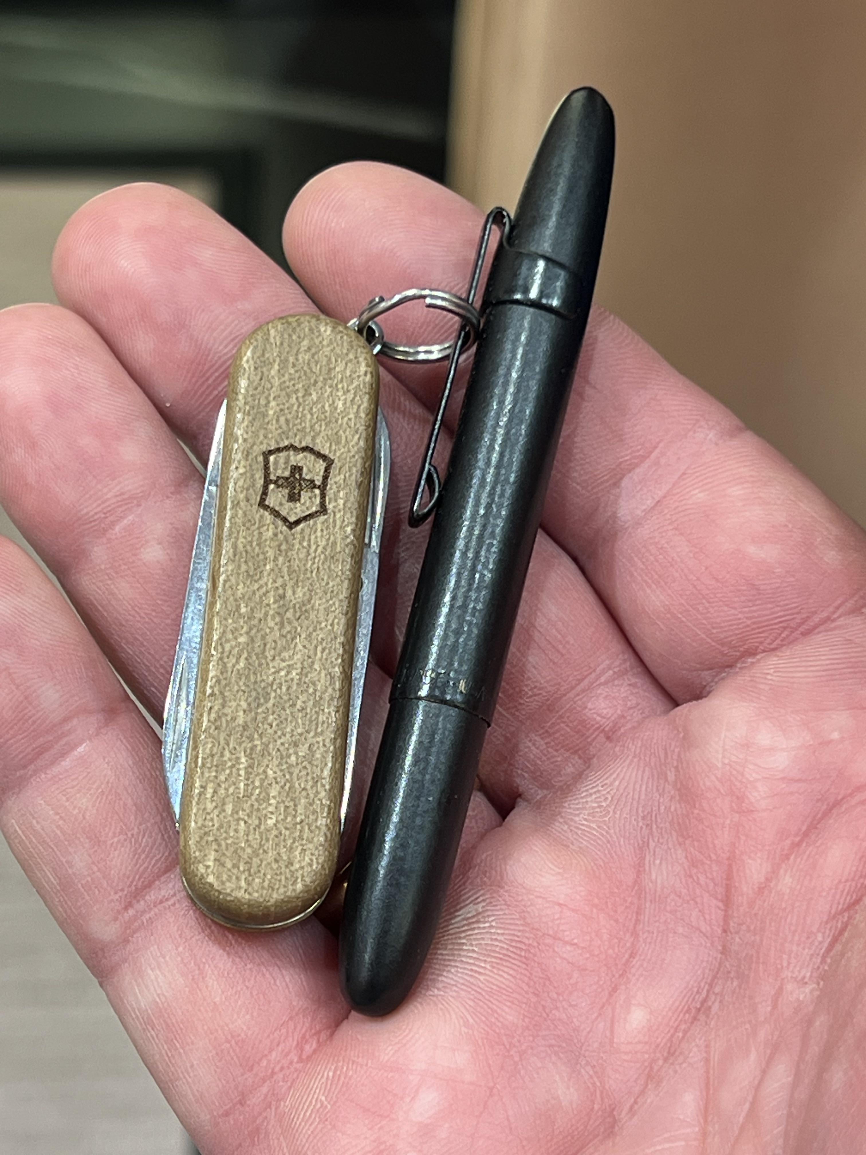 This is my carry when I dress up a bit. A victorinox classic in wood scales I bought in november before returning from Tenerife and a fischer space pen (bullet?) I got from a store as a memory when the man passed away. Both with a lot of sentimental value.