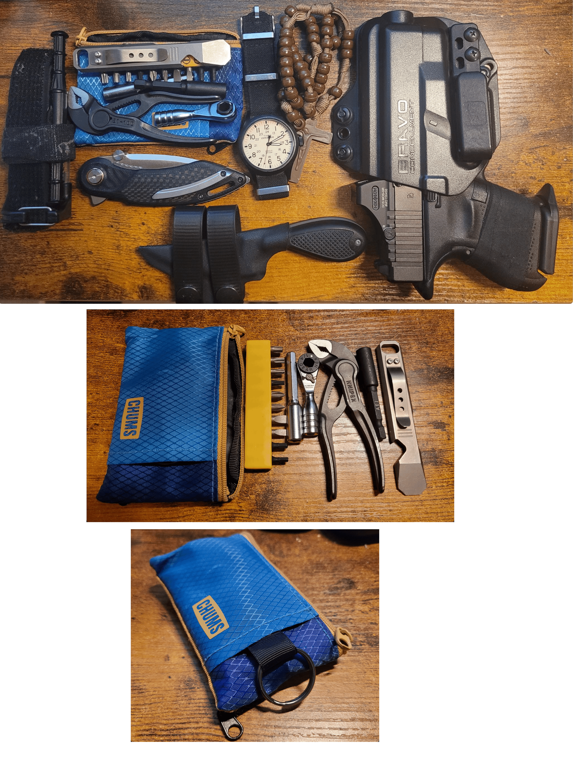 G26 Clinch Pick Snakestaff Systems TQ Timex expedition watch ICON Drop Point Knife DAILYCARRYCO Titanium Pry Bar KNIPEX Cobra Mini Ratchet Wrench (Extender, T-Handle) and some 1/4 bits Chums Surfshorts Wallet as tool bag.