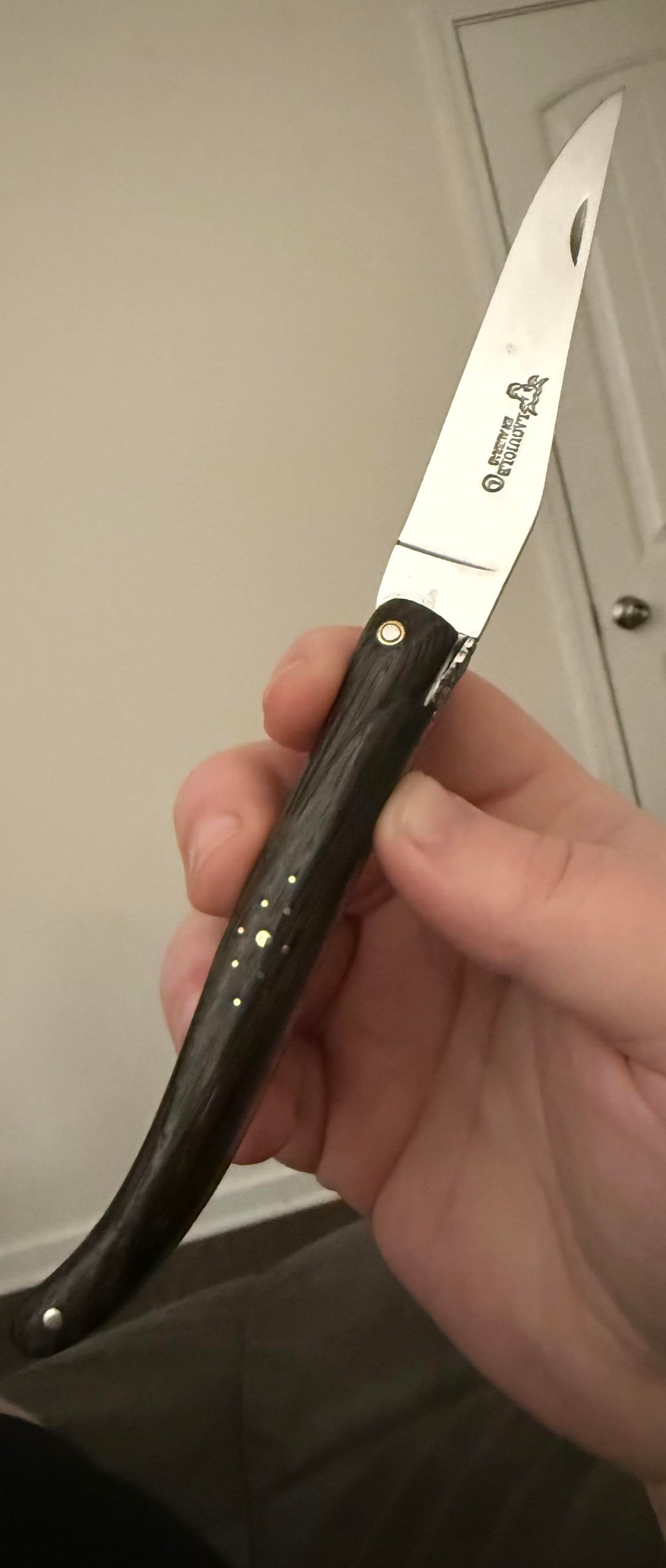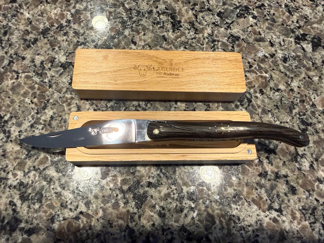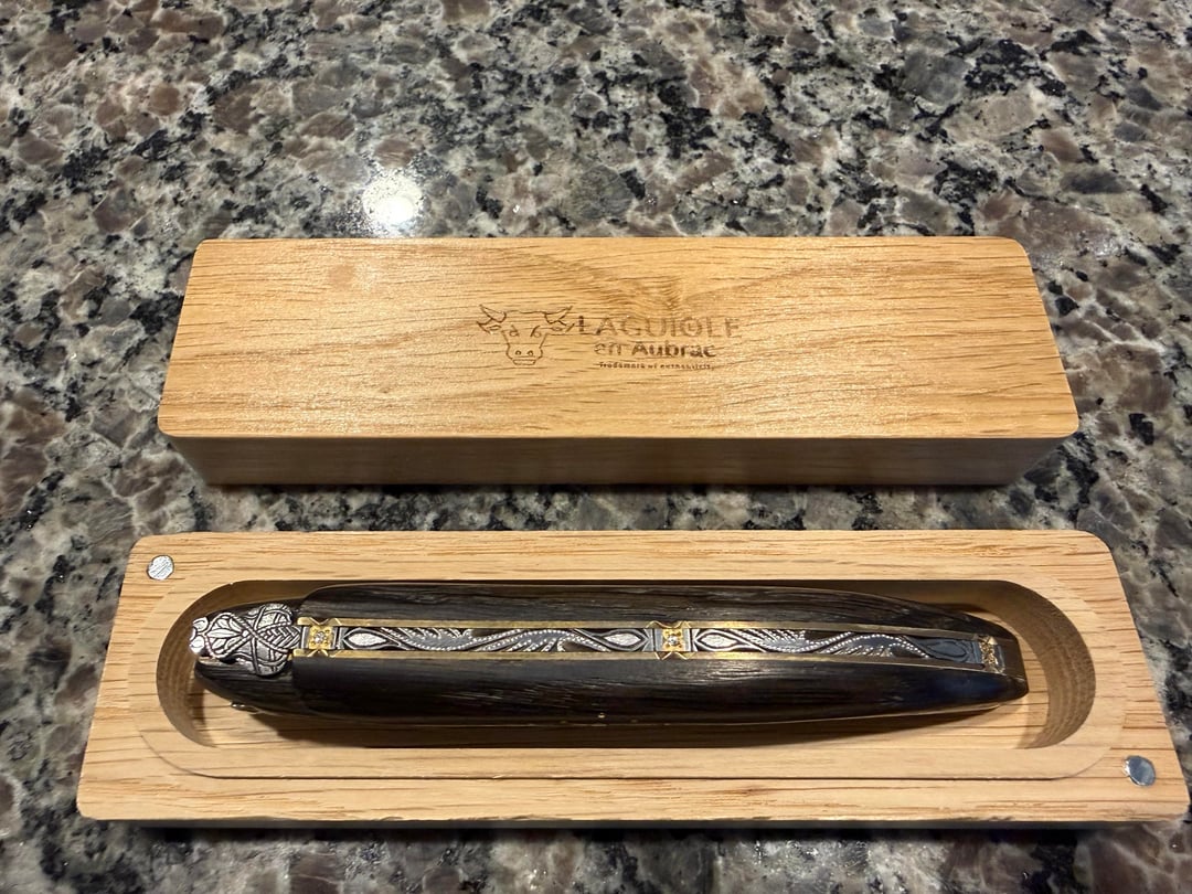 Handmade by a single artisan in the Laguiole region of Aubrac, France…This knife uses authentic 12C27 Sandvik stainless steel, Brass, Morta aka “Bog wood” which is a rare wood, created by semi-fossilized oak trunks buried in peat that’s over 5,000 years old…and three small diamonds.