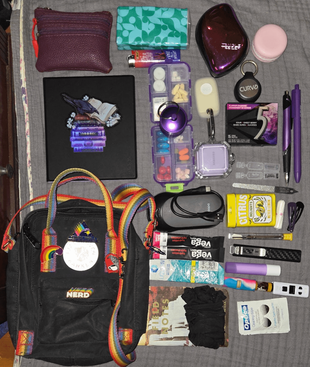 Contents: Onyx Boox Page, Wallet, tissues, lighter, walk-about pharmacy + a full day of personal meds, Samsung buds, Ocoopa hand warmer battery bank with cable, vega and liquid iv electrolytes, field notepad, compression gloves, tangle teezer brush, pink container of hand lotion, curvd earplugs, gum, saline eye drops, 2 pens, nail file, lemon candy, tampon, hair clips, eyeglass repair kit, CRKT box cutter, lip balm, boxhot vape on a kodo battery with a mouthpeach mini, glass cleaning wipes. Missing my keys, watch, and phone but they live in my pockets/wrist more than my bag so not pictured.