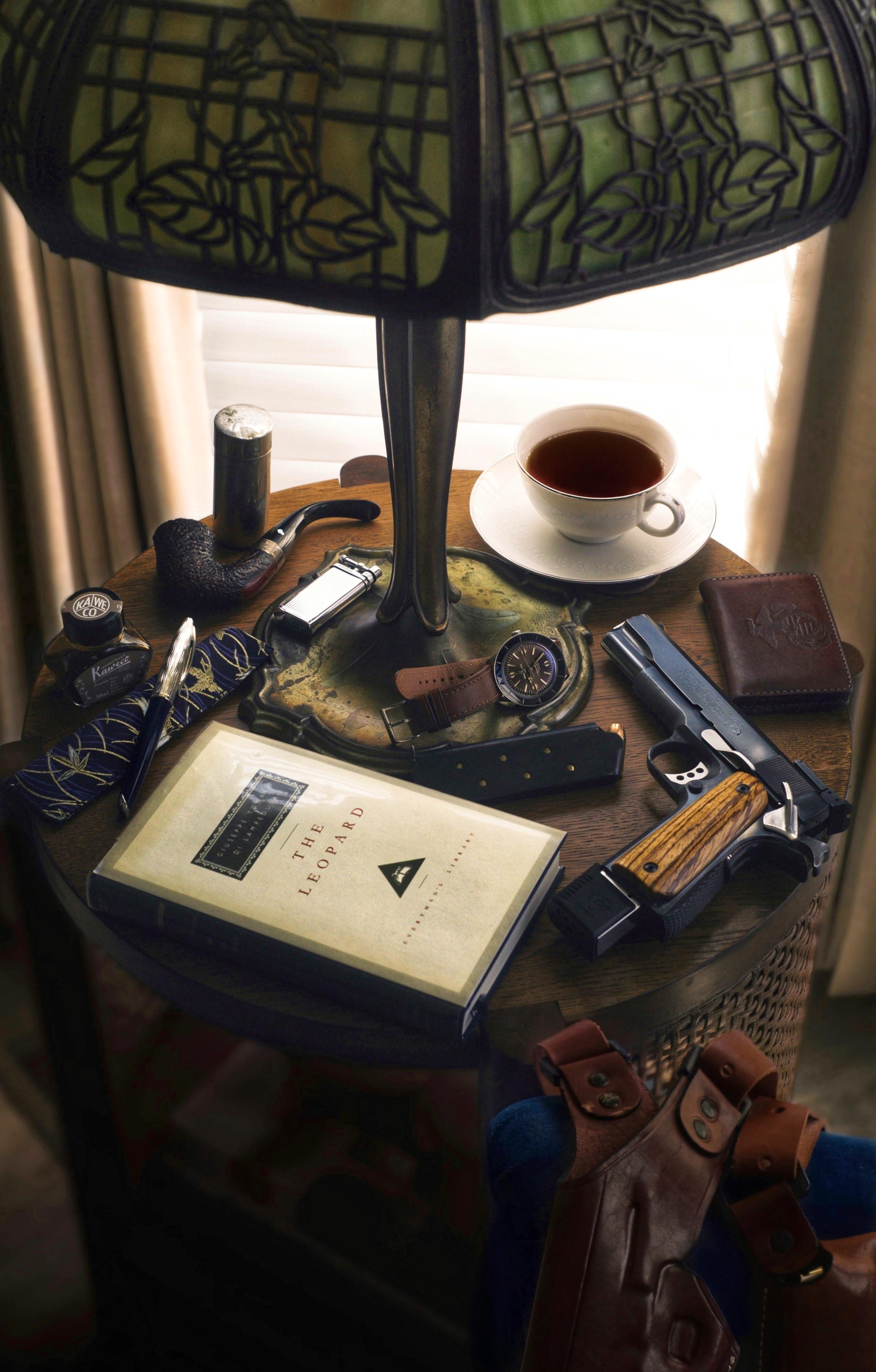 1. The Leopard, Giuseppe Lampedusa 2. Colt 1911 Government 3. Spare mag (the 10rnd is the spare, I just have it in for the pic) 4. Breitling Superocean ‘57 5. USMC wallet (brand unknown) 6. Waterman Carène fountain pen (M) 7. Kaweco Caramel Brown ink 8. Amazon pen sleeve 9. Peterson Sherlock Original 10. I.M. Corona Old Boy Lighter 11. Carter Hall tobacco in an old shaving brush tube 12. Armadillo Leather Co shoulder holster 13. Loose Earl Grey in a Noritake Edelweiss china cup and saucer.
