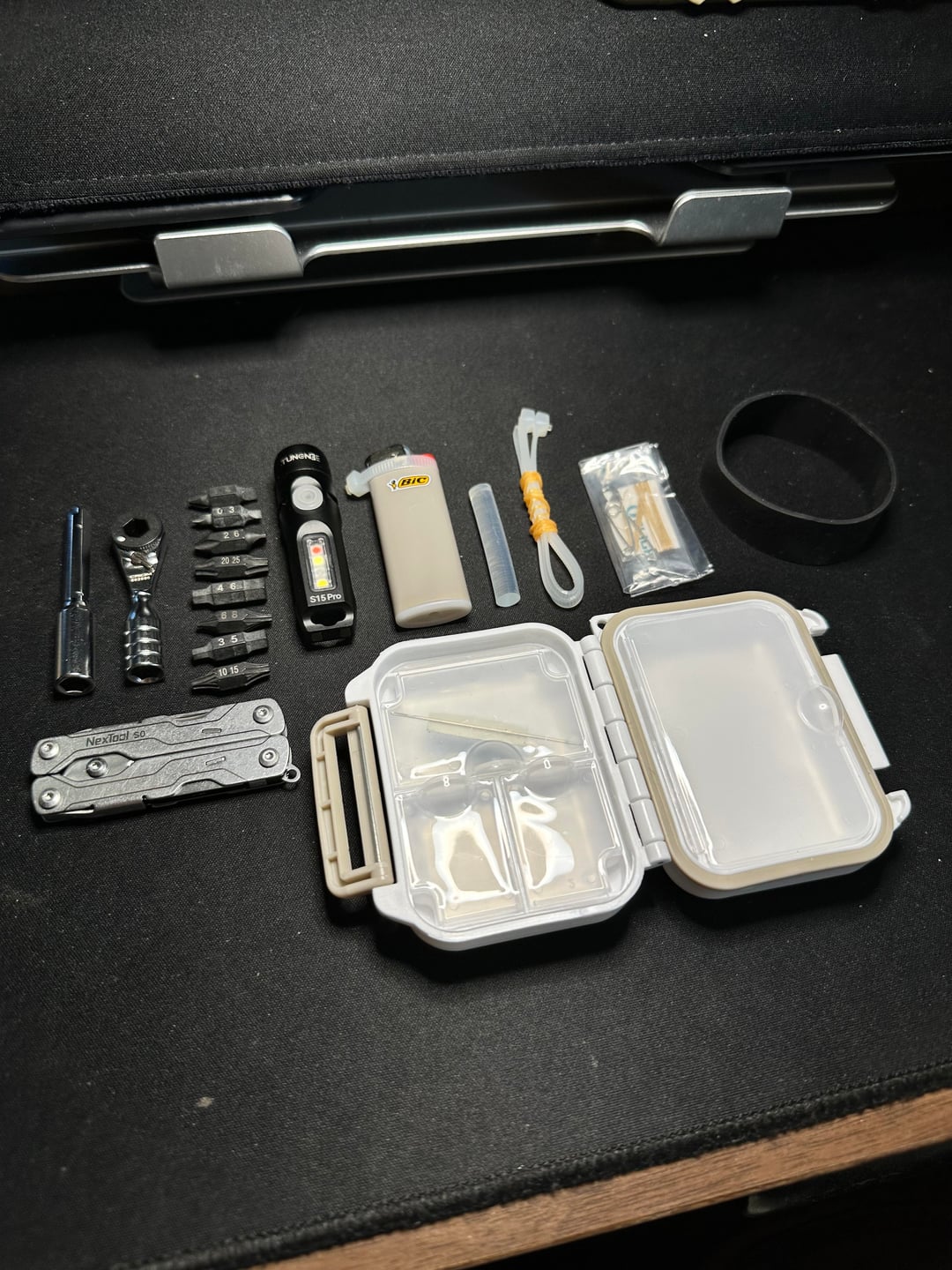 Here’s a list of the items I included, if y’all are curious: Nextool Micro Mini Sailor Scissors S0, CROM 1/4 in. Mini Ratchet Wrench, Steinwhale Mini Bits, Tunenge S15 Pro flashlight, Mini BIC lighter, hot glue stick, mini zip ties, and a compact sewing kit in a small zip bag