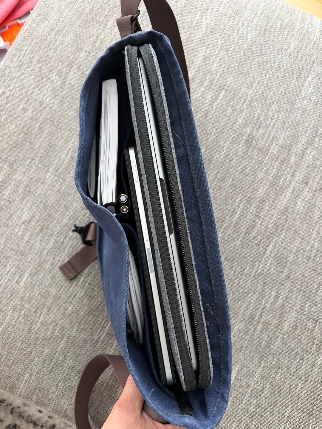 – waterfield wax cancels cycling bag – iPad Pro M1 with Magic Keyboard – MacBook Air (test development device) M2 – AirPod Pro v3 – iPhone With Andar wallet and case – notebooks – Lamy 2000 medium, rOtring 800 .07, mont blanc pex ballpoint – Samsung development device for company app – Work and personal keys with AirTag. – cables and anker 100w for the main MacBook Pro – bellroy wallet