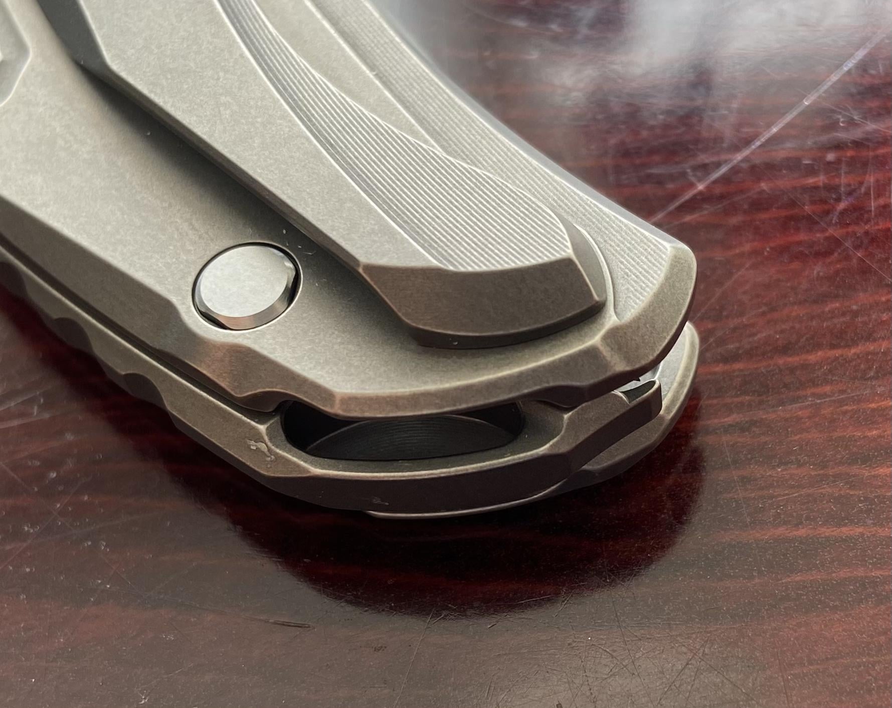 I've posted a picture of the back end of my F95. Just plain, ho-hum S90V and titanium. But I've zoomed in on the back of the clip, backspacer, and lanyard hole. Look at how fine the micromilling lines are on the clip and lockbar base, and how they curve with and around the curves of the knife. Look at how the lanyard hole isn't just drilled in or cut out; rather, space has been scalloped out on both the scales and the backspacer in a way that reflects the quasi-steampunk aesthetic of the whole knife. Look at where the tip of the knife points directly at where the backspacer ends, which ends in a taper rather than a blunt cutoff. Notice how they've chosen to expose the parts of the screw that prevent it from being free-spinning rather than hide them inside the hole. It's an artistic masterclass in design and engineering. Nothing is overdone, nor is anything an afterthought.