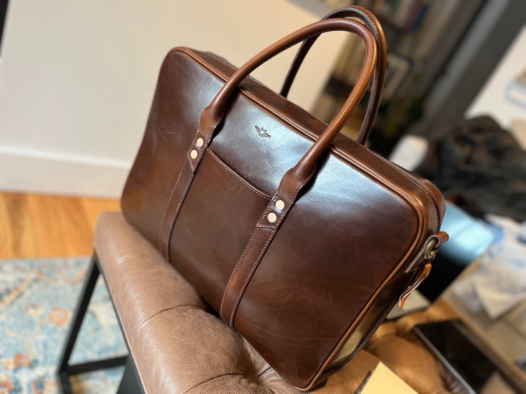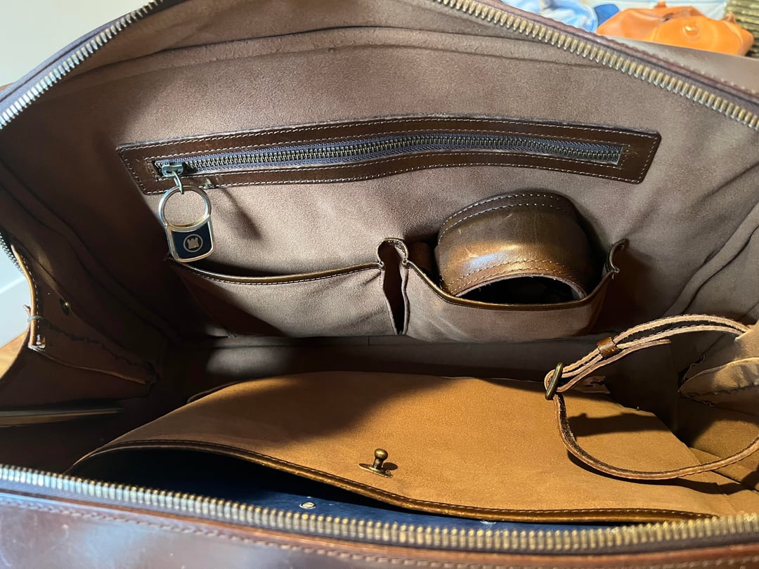 Previously I carried a Saddleback Leather Thin Briefcase for 12 years, and I’ve had dozens of other bags and satchels duffles, etc. this past year I wanted something a little larger for a longer commute and I wanted to start in on a vegetable tanned briefcase for the patina (the saddleback bag in dark coffee doesn’t patina well, just looks old).