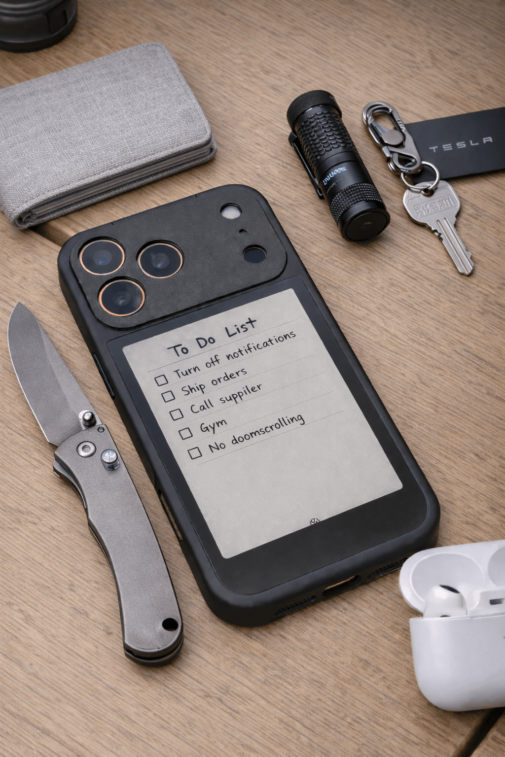 iPhone (e-ink back case) : List lives on the back. Flip it, check it, pocket it. Keeps me from unlocking my phone and somehow ending up 20 mins deep on Reddit.